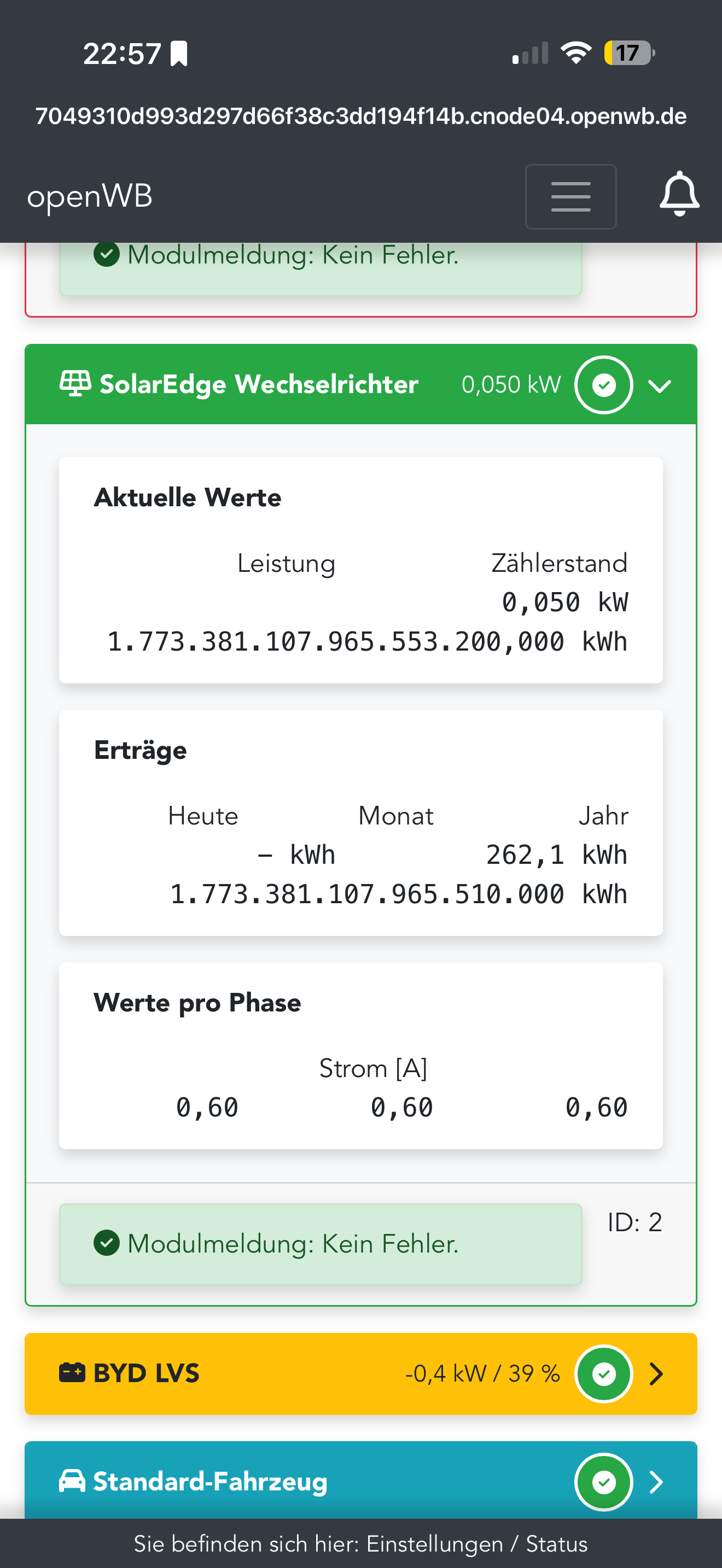 Durch das Update auf die neueste Solaredge-Software funktioniert die Openwallbox nach frustrierenden Monaten nun endlich wieder normal. Ich habe mich nach neuen Wallboxen umgeschaut und war innerlich am schimpfen, weil diese Software immer instabiler wurde mit beinahe täglichen Abstürzen.