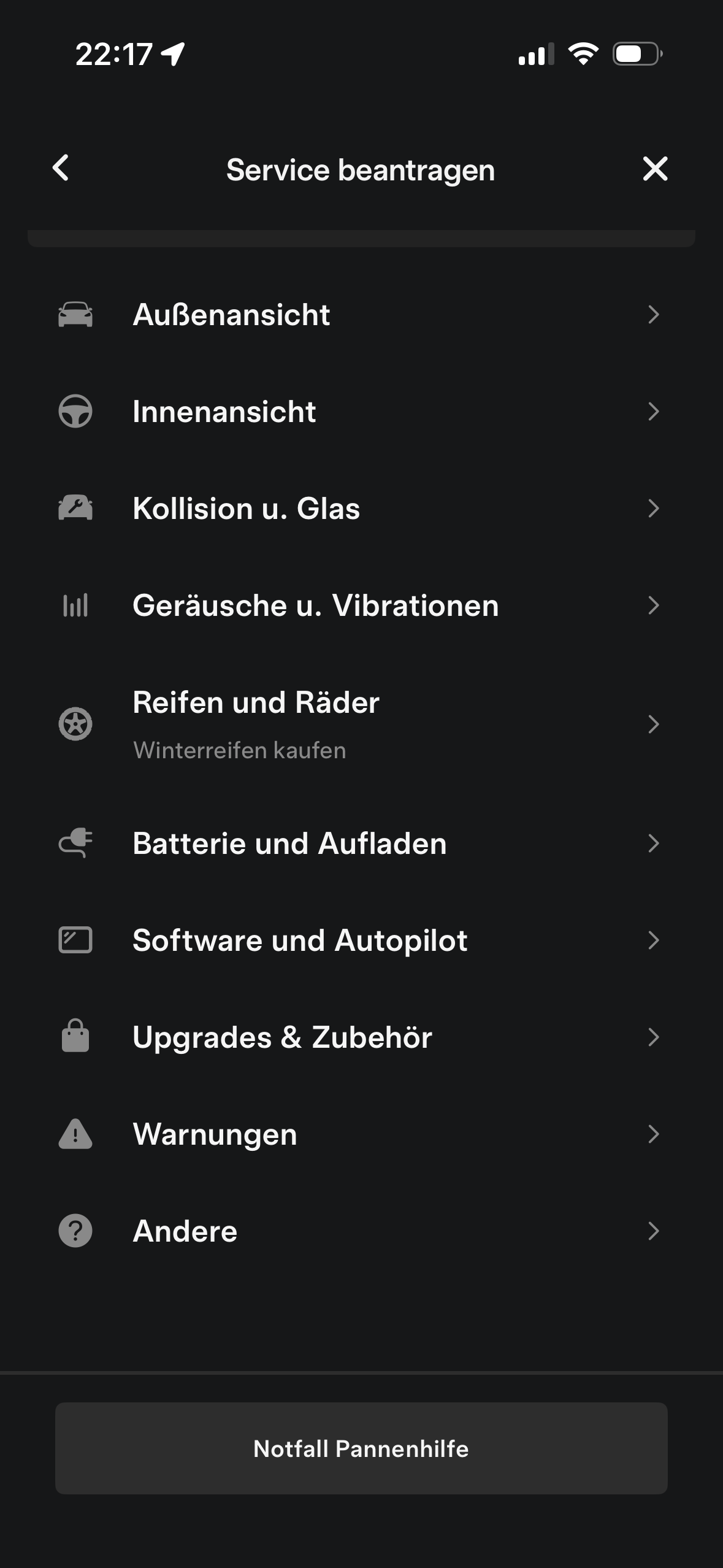 Du gehts in der App auf Service, dann Service beantragen und kannst aus mehreren Unterpunkten auswählen (siehe Anhang) - in meinem Fall „Batterie und Aufladen“. Dort beschreibst du dein Problem und im nächsten Schritt wird jemand von Tesla deine Problembeschreibung mit eventuell vorhanden Fehlerprotokoll aus deinem Auto und mutmaßlich internen Infos/Problemen zum Firmwarestand abgleichen.