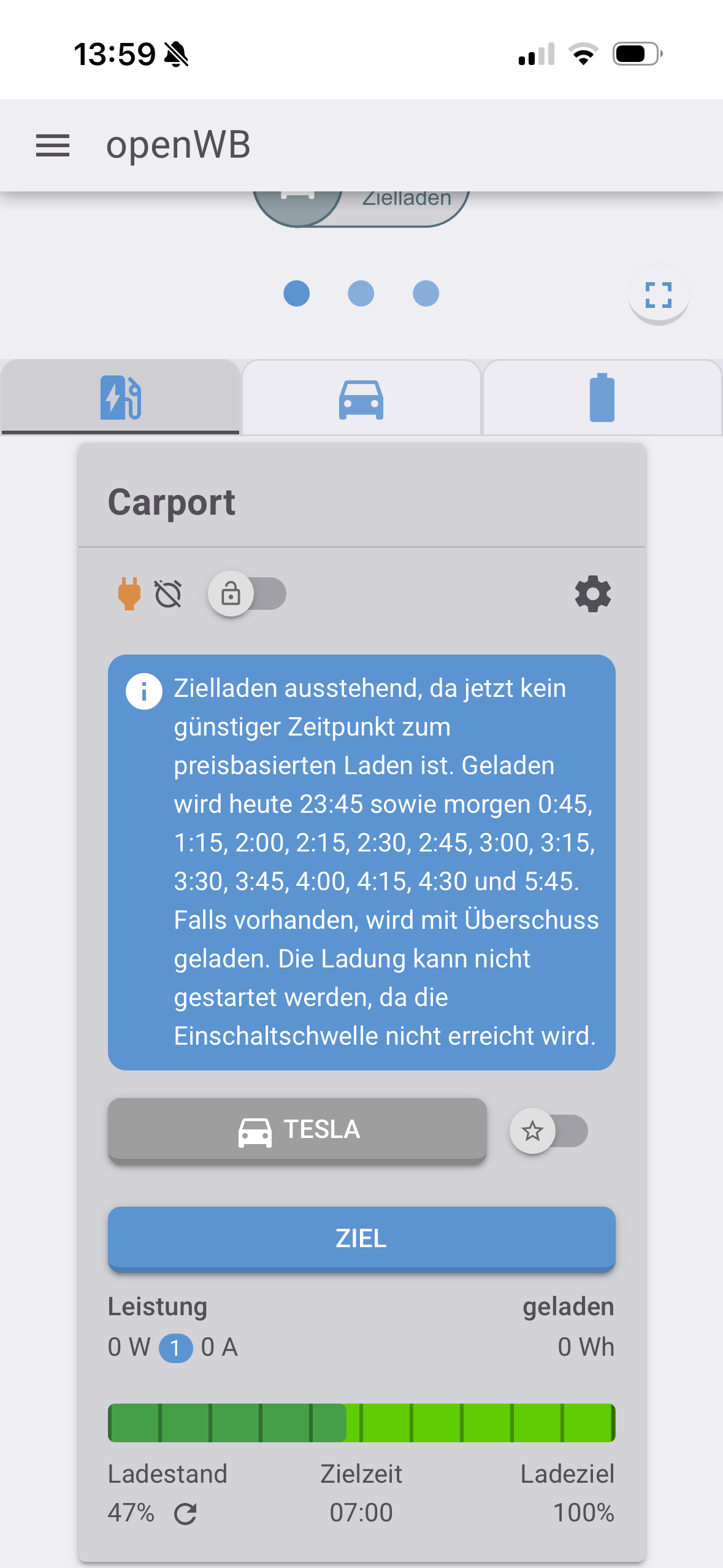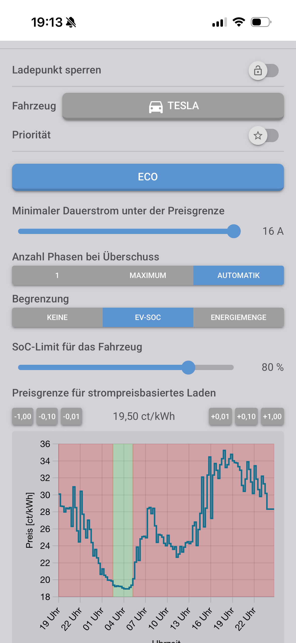 Wenn die Möglichkeit besteht, hätte ich gern im Ecolademodus eine Anzeige der zu erwartenden kWh bei eingestellter Preisschwelle und Stromstärke. An meinem Beispiel (siehe Anhang) ist es schwer abzuschätzen wie viel Strom am Ende im Akku ankommt. Das scheitert hauptsächlich daran, dass aufgrund der groben Zeitachse nicht ganz klar ist wie lang insgesamt geladen wird.