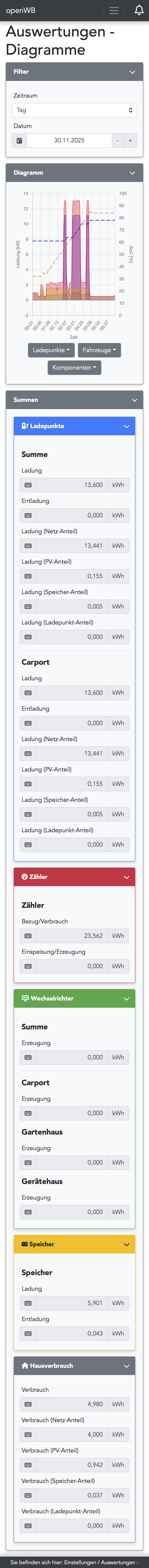 Bin jetzt erst zum Test gekommen...LenaK hat geschrieben: Fr Nov 28, 2025 9:28 amIn dem Log wird kein Eintrag erstellt, weil gar kein Auto angeschlossen ist. Bei mir wird trotz Fehler im SoC-Modul ein Eintrag erstellt. Kannst Du bitte ein main.log vom Zeitpunkt des Absteckens posten und ein Auszug aus http://<ip der openWB>/openWB/ramdisk/chargelog.log?knotzchef hat geschrieben: Do Nov 27, 2025 7:45 amTut bei mir auch nicht....Till hat geschrieben: Do Nov 27, 2025 7:34 am Guten Morgen,