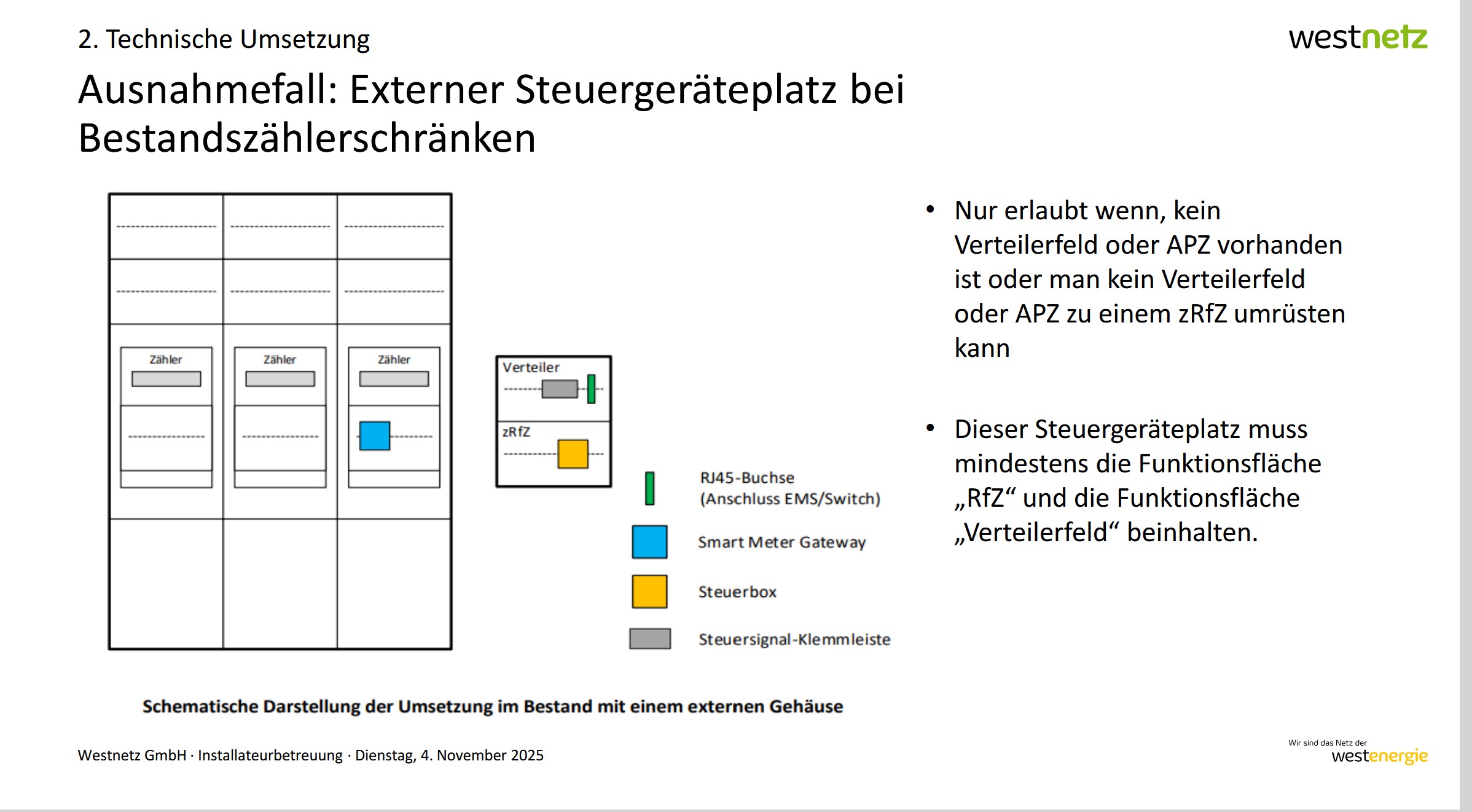 das pdf der Westnetz hat sich in 11.25 geändert, hier ist aber schon die aktuelle Version drin. So wie ich das lese ist der Umbau des Zählerplatzes von Tisch und es kann auch neben dem Zählerschrank installiert werden. Wäre ja für etliche ein großer Vorteil. Was ich nur nicht richtig verstehen kann ist die geforderte Art vom Anschluß: