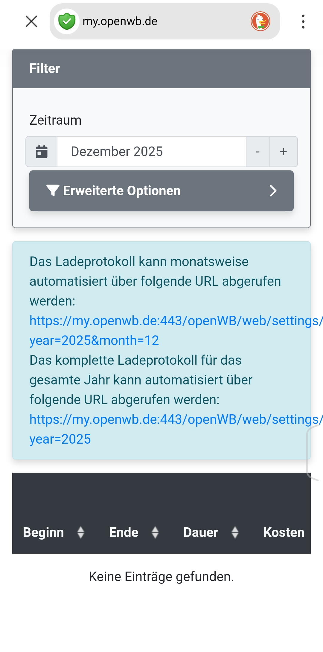 Im Diagramm ist alles detailliert sichtbar, Daten, Steuerung usw. alles normal. Nur das Ladeprotokoll ist leer seit 23.11.