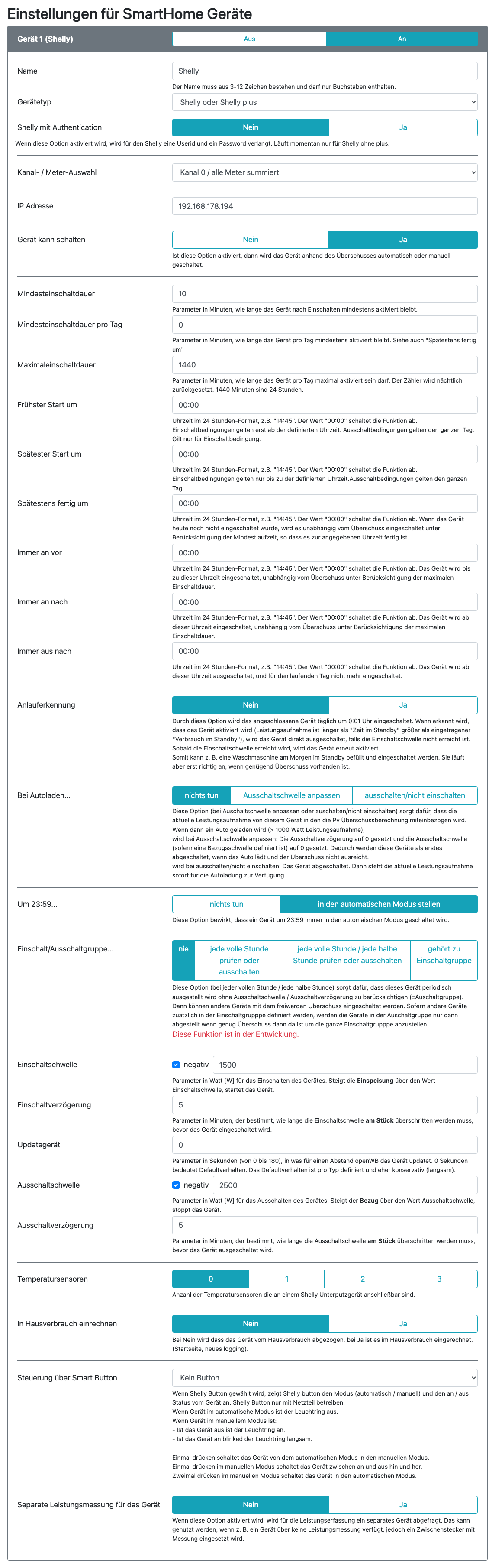 Ich möchte beim Überschreiten einer PV-Überlast (2500 W), dass meine Shelly abschaltet und beim Unterschreiten einer PV-Überlast (1500W) wieder einschaltet. Standardzustand ab 0:00 Uhr soll eingeschaltet sein. Ich habe verschiedene Beiträge im Forum gelesen, so dass mir klar ist, dass ich beim der Ausschaltschwelle 2500 mit Aktivierung von "Negativ" einzustellen ist (siehe: viewtopic.php?p=80999#p80999).Heavendenied hat geschrieben: Fr Jan 27, 2023 2:24 pm Warum willst du das am anstecken des Autos festmachen? Warum nicht einfach am EVU Bezug?