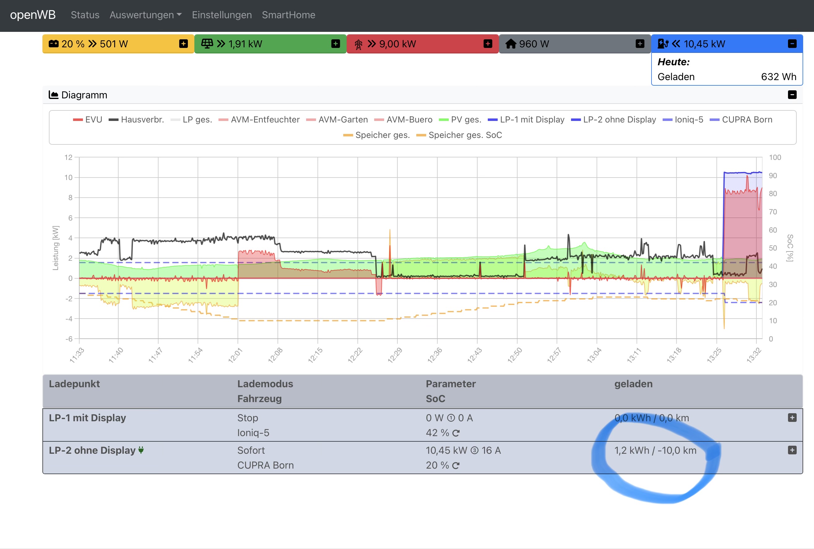 Das Ladeprotokoll zeigt auch bei mir negative geladene Kilometer an, da kann aber die openWB nichts dafür, denn die Reichweite wird (bei mir) vom Fahrzeug bereitgestellt. Wenn die aus irgendwelchen Gründen während einer kurzen Ladung sinkt (z.B. durch Standheizung), entsteht dieser Eindruck.