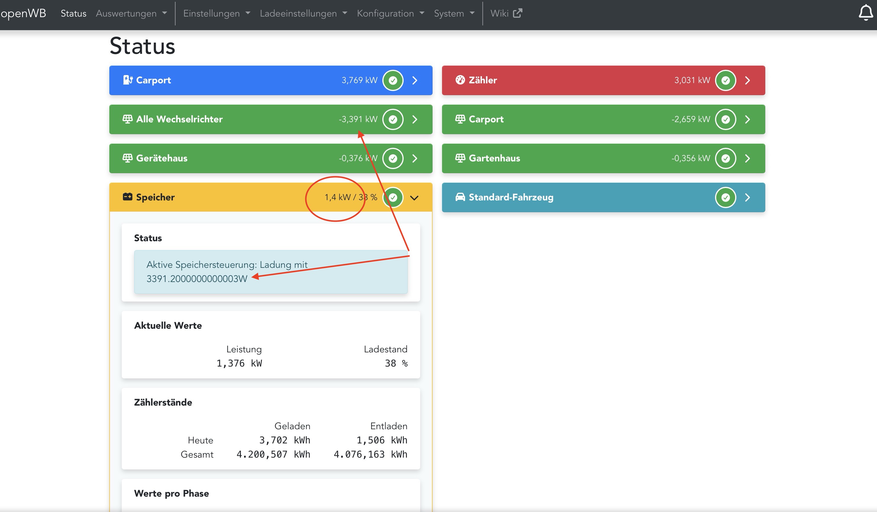 Irgendwas stimmt noch nicht ganz. Erstens hat mein Auto im Eco Lademodus nicht mehr auf 3 Phasen geschalten. Zweitens habe ich die Steuerung siehe Screenshot so eingestellt, dass der Speicher also in voller PV Ertragsgröße laden müsste. Im Status steht auch, dass er mit genau der PV Leistung laden wollen würde, lädt aber real nur mit rund 1/3 der Leistung. Außerdem ist mir aufgefallen, dass der Hausgebrauch beim einschalten der Ladung mit Speichersteuerung deutlich nach oben ging (siehe Anhang).