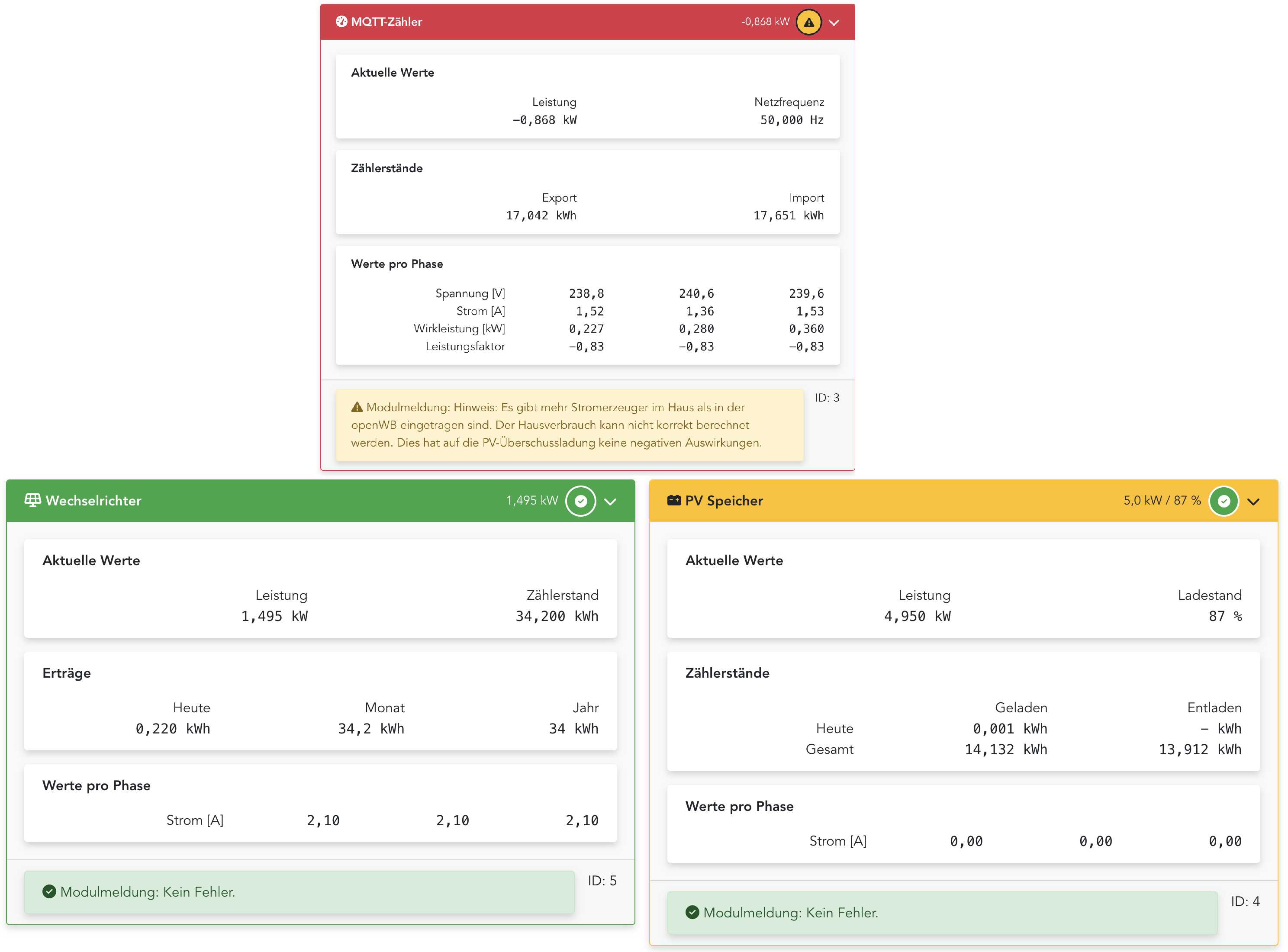 - Der MQTT-Zähler schmeisst regelmässig den Fehler 'Modulmeldung: Hinweis: Es gibt mehr Stromerzeuger im Haus als in der openWB eingetragen sind. Der Hausverbrauch kann nicht korrekt berechnet werden. Dies hat auf die PV-Überschussladung keine negativen Auswirkungen.'. In den Logfiles finde ich dann auch das hier: 2026-03-12 11:00:05,091 - {control.counter_all:107} - {ERROR:MainThread} - Ungültiger Hausverbrauch: -6714.0W, Berücksichtigte Komponenten neben EVU [{'id': 5, 'type': 'inverter', 'children': [{'id': 4, 'type': 'bat', 'children': []}]}, {'id': 16, 'type': 'cp', 'children': []}, {'id': 17, 'type': 'cp', 'children': []}, {'id': 4, 'type': 'bat', 'children': []}] - kann mir jemand sagen, was genau hier nicht stimmt?
