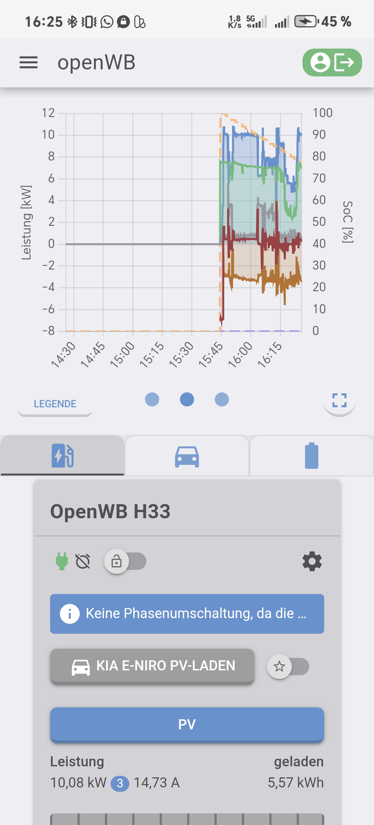 Ich habe das Auto angesteckt, als der Max-SoC der passiven Speichersteuerung überschritten war. Es ist eine erlaubte Entladeleistung von 1kW für diesen Fall konfiguriert.