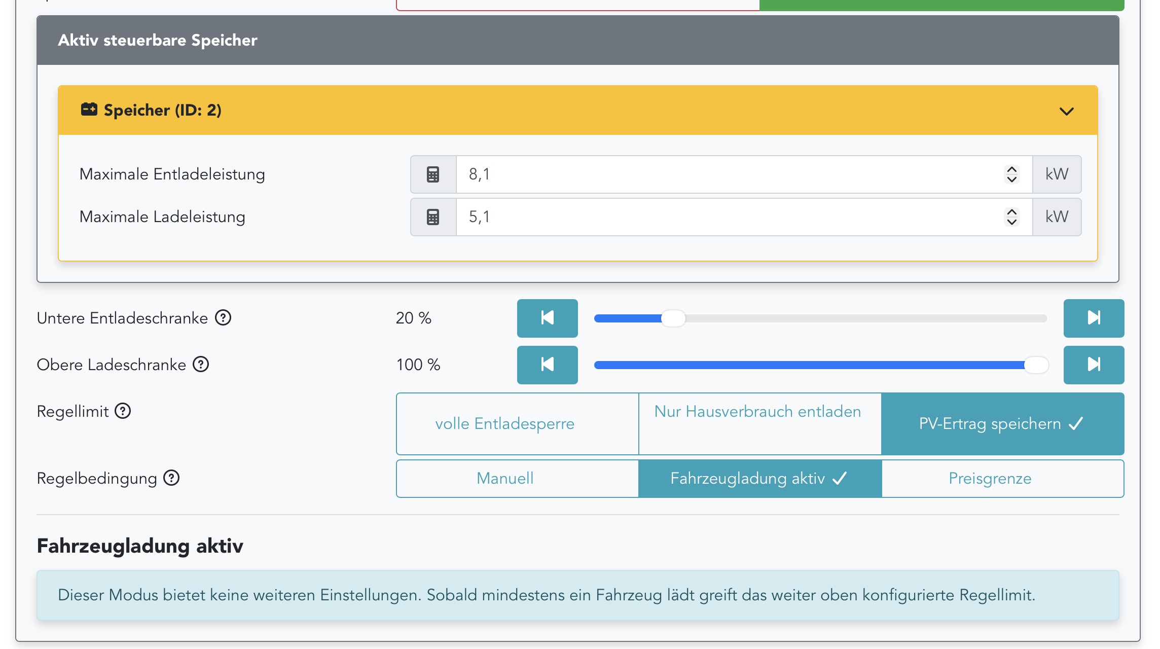 Thema aktive Speichersteuerung: max SoC auf 100% eingestellt. Im Status steht "Speicher befindet sich oberhalb des maximalen SoC - Ladung