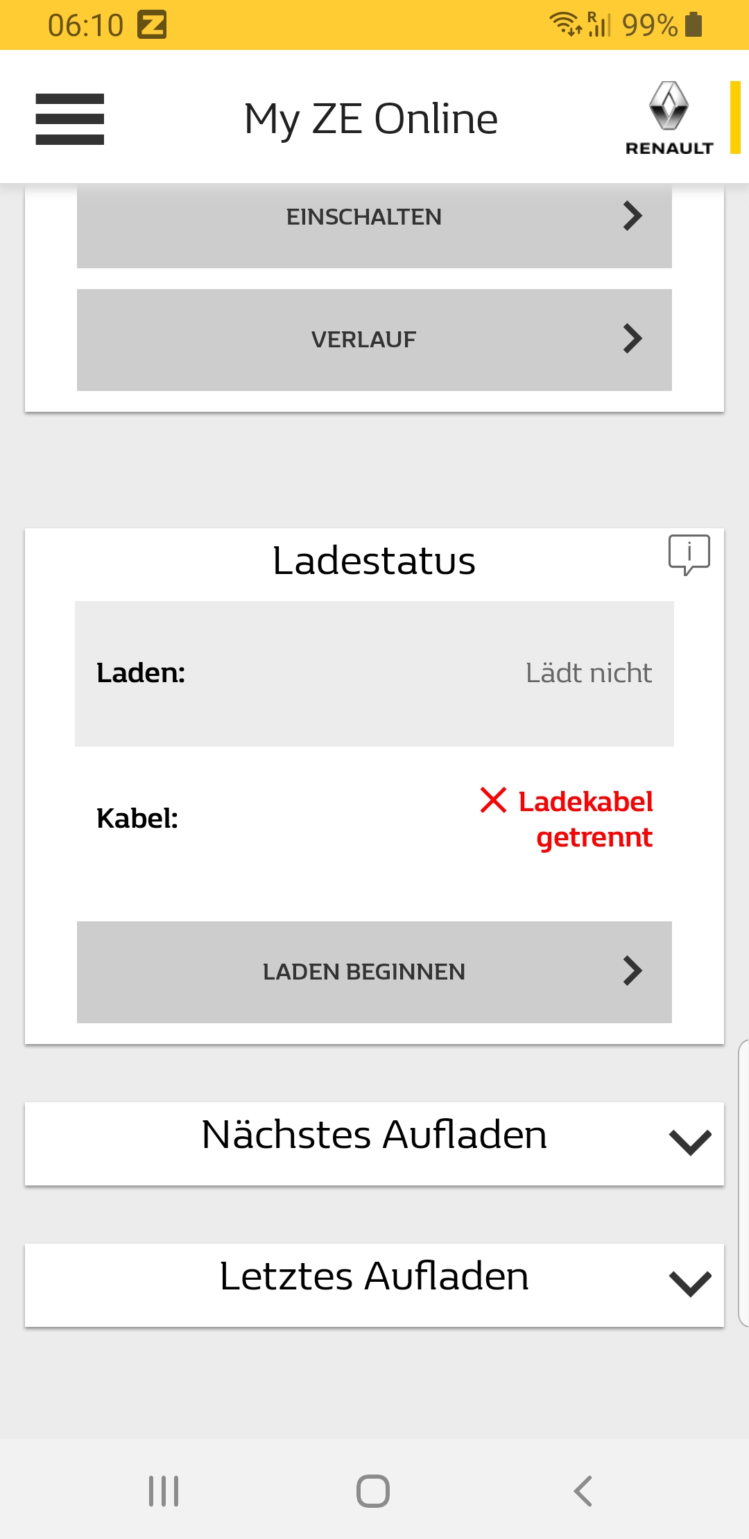 Das Laden kann ich mit dem Button "Laden beginnen" starten . Das macht natuerlich nur Sinn, wenn Zoe eingesteckt ist, kein anderer Ladestart terminiert ist und die Ladestation entsperrt ist.