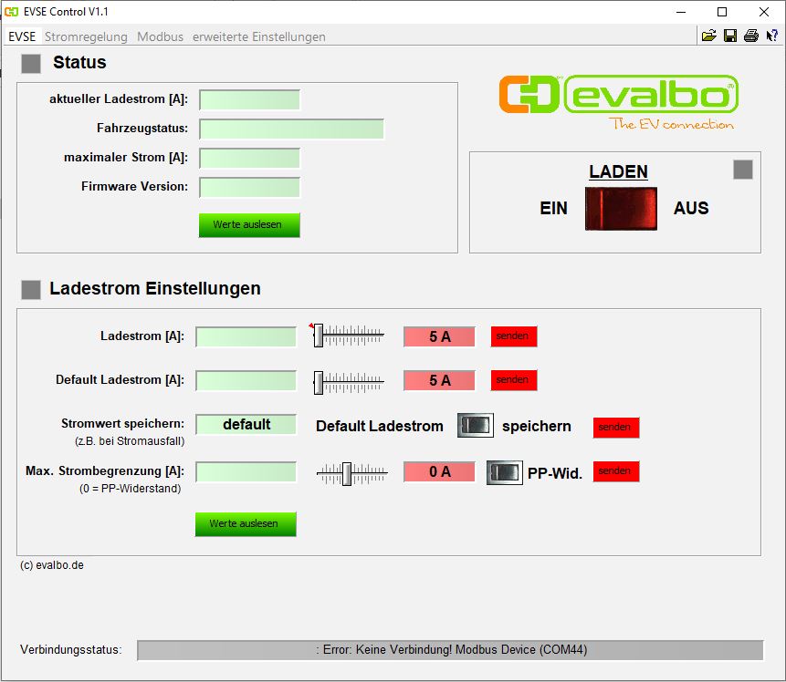 Ich habe meine Simple EVSE WB angeschlossen, den USB Treiber installiert und die Software EVSE Control 1.1 von ( wie hier beschrieben ... https://www.evalbo.de/anleitungen/evse-control/ ) installiert und eingerichtet