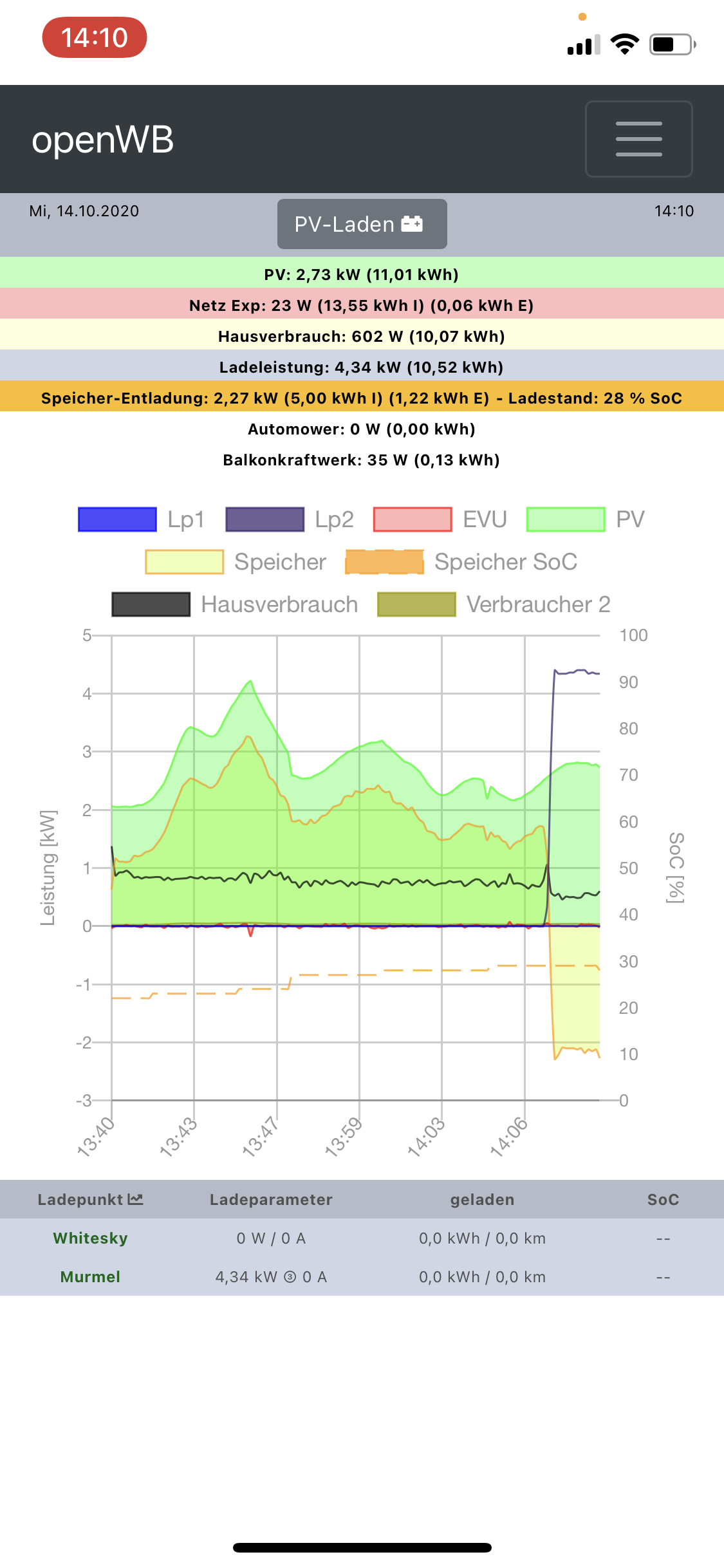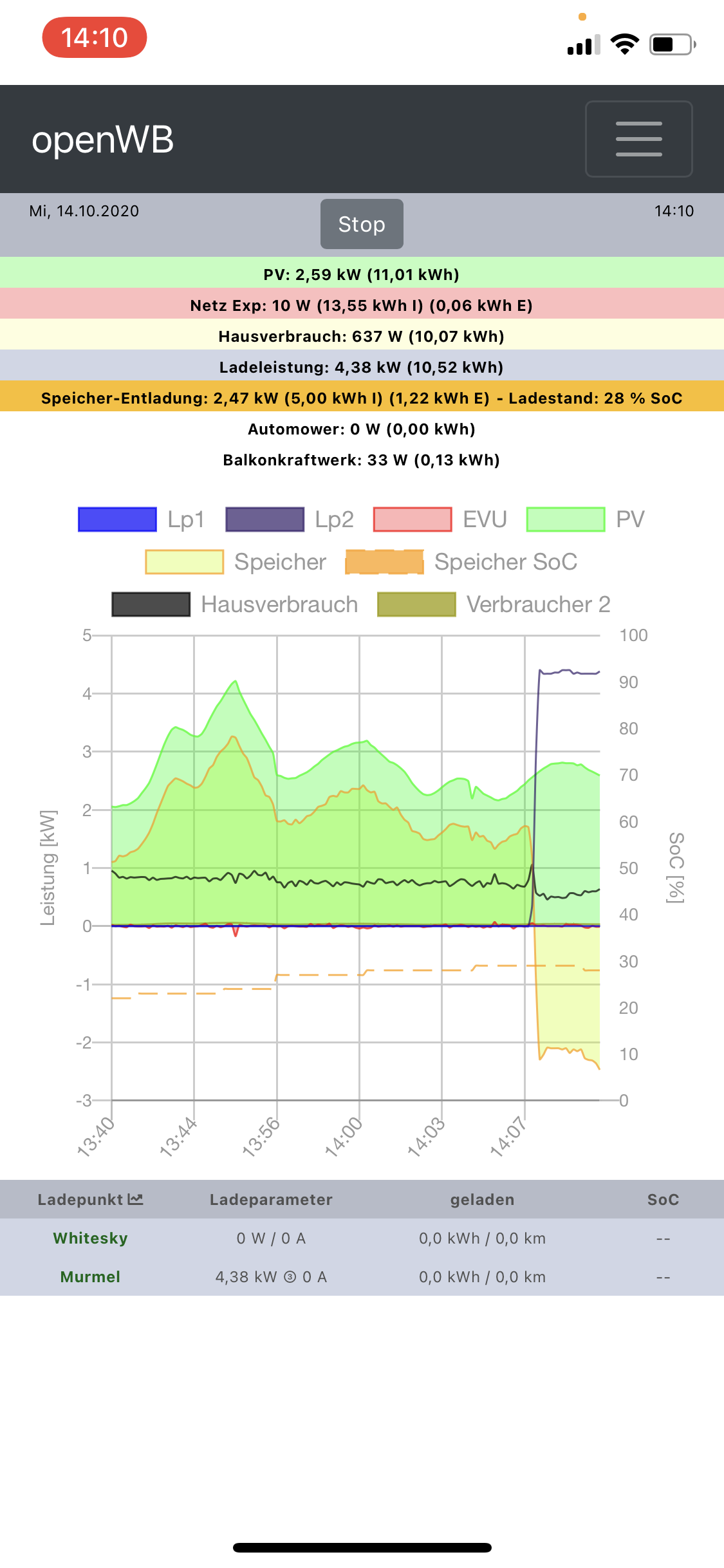 Dann scheint der zweite Ladepunkt (NRGKick Connect) zwar richtig zu laden und regeln, wenn einmal die Ladung gestartet wurde, sobald aber nicht mehr genug von der PV Anlage kommt bleibt der Ladepunkt auf eine bestimmten Ladestromstärke stehen und lädt unerwünscht weiter den Speicher leer oder macht Netzbezug. Die Ladung scheint mit NRGKick nie zu stoppen.