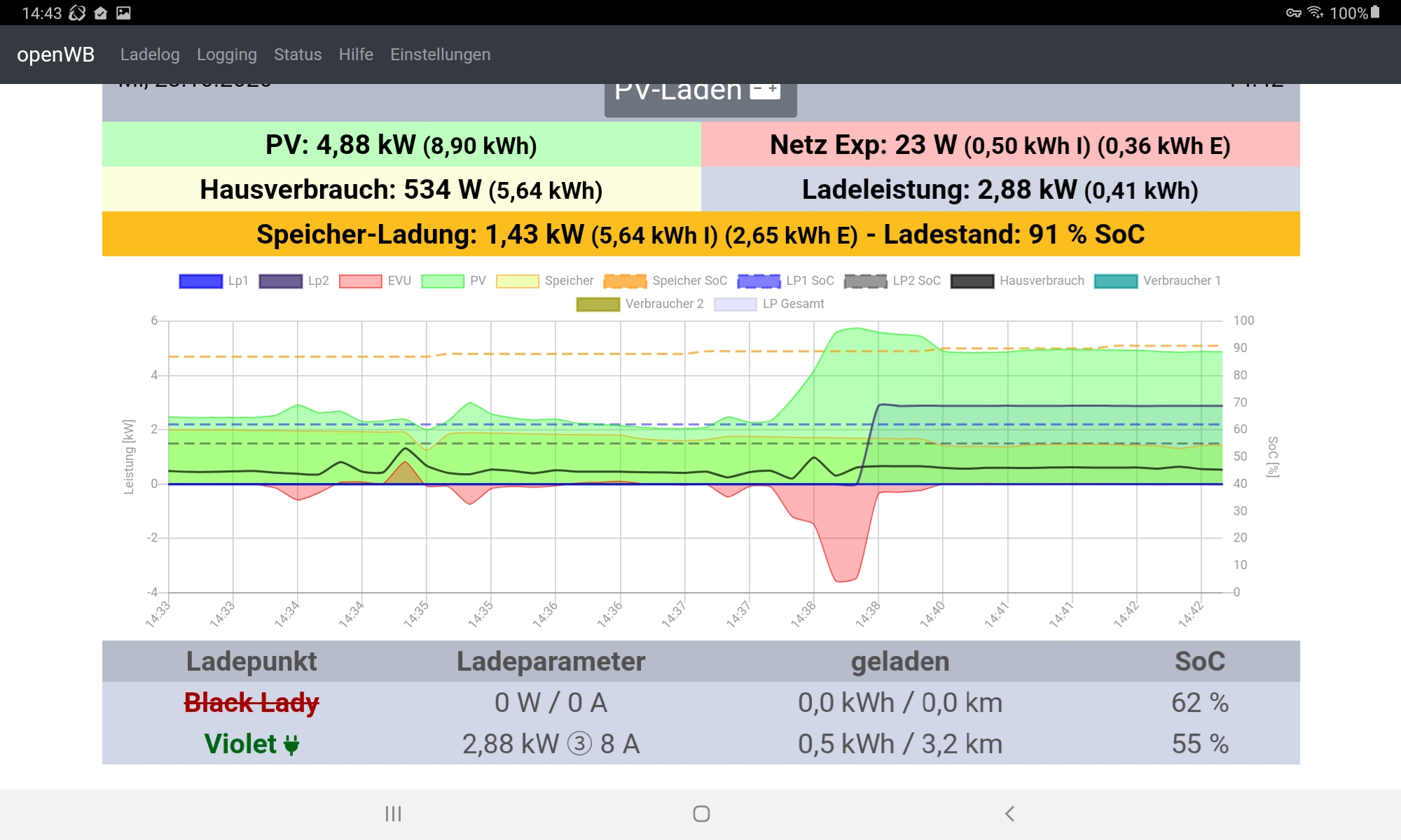 4. Falls dann noch Überschuss vorhanden, via OpenWB das E-Auto laden (wahlweise reines Überschussladen ohne Netzbezug was der Normafall sein wird oder wenn auch wohl selten benötigt mit Netzbezug ggf. mit voller Leistung, falls es mal schneller gehen muss)