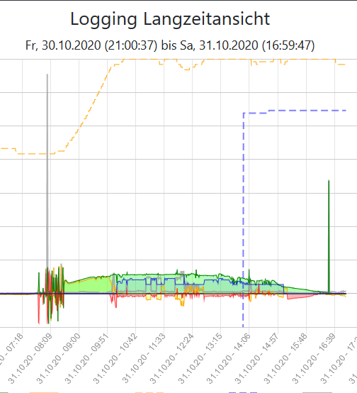 Das Phänomen scheint nur einmal morgens und einmal abends aufzutreten, wenn der zweite, reine PV WR aktiv wird bzw. seinen Betrieb einstellt...