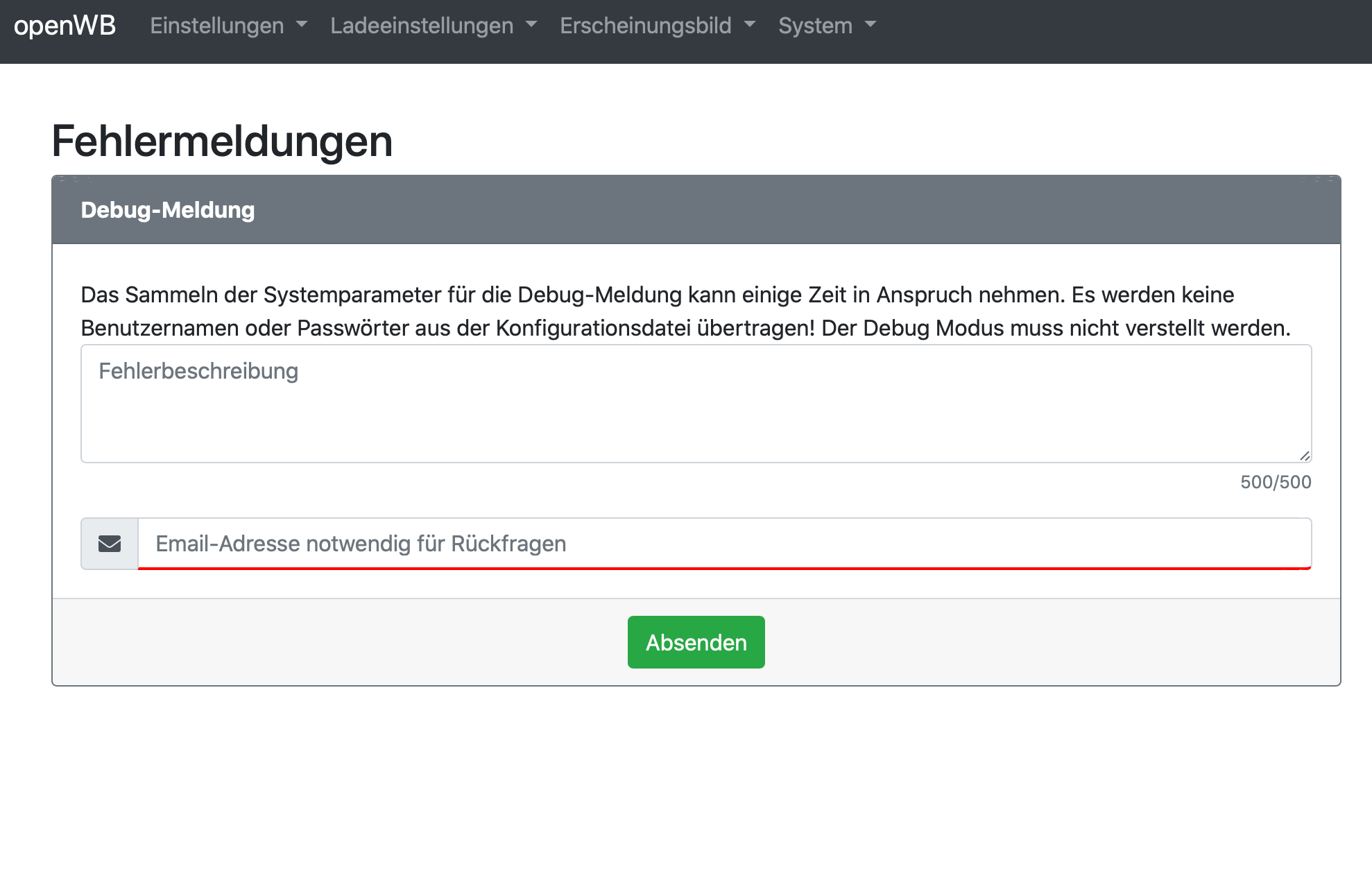 Hardwareprobleme bitte über die Funktion Debug Daten senden mitteilen oder per Mail an support@openwb.de