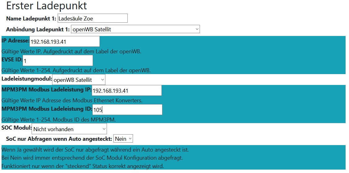 Bei obiger Konfiguration wäre als Ladepunkt bei EVSE und Ladeleistungsmodul openWB Satellit zu wählen.Sorry für meine vielleicht harschen Worte und ich bin mir sicher, dass der Support mir schnell helfen wird,