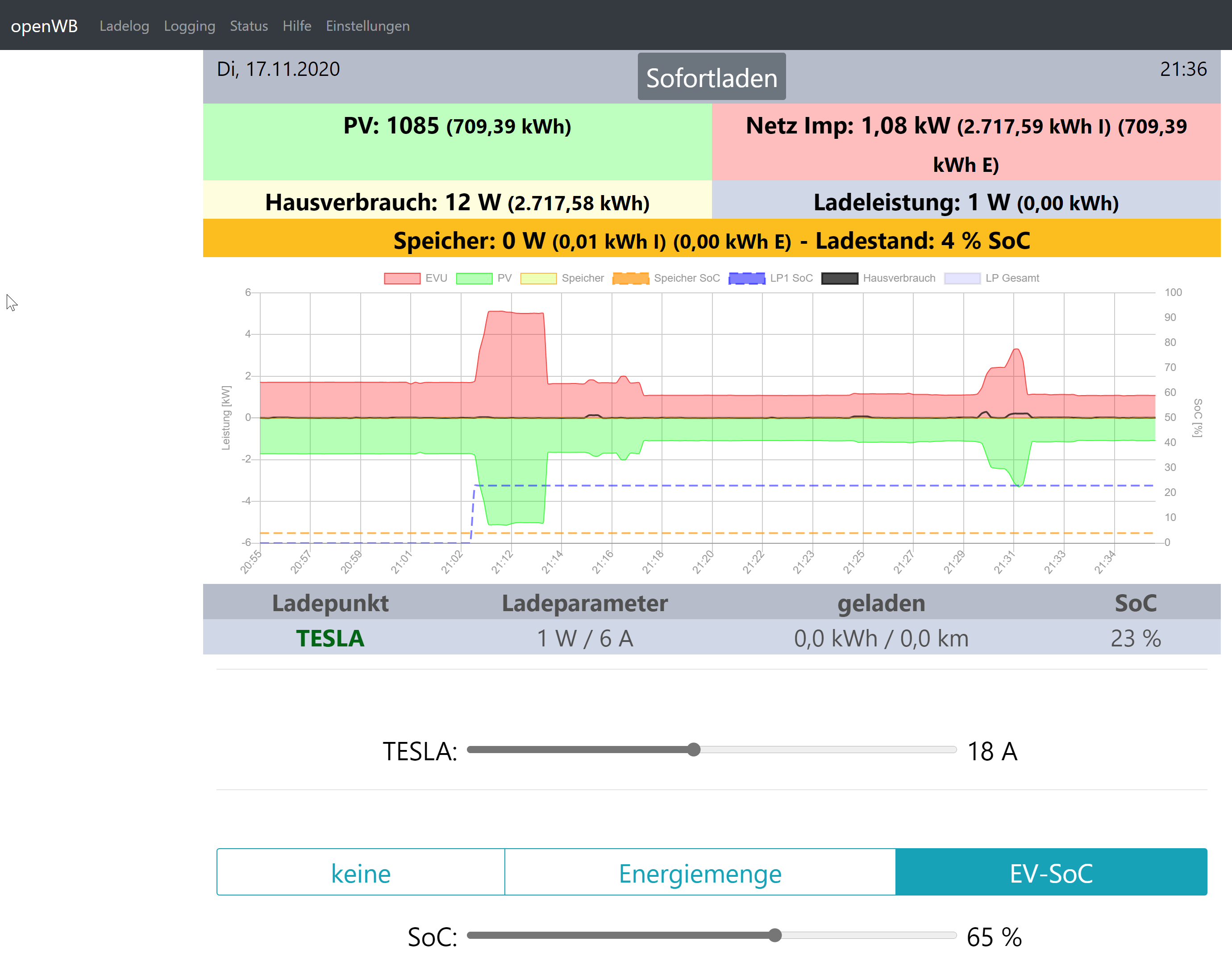 Das "Go" scheint da zu sein, denn der Sollvorgabewert steht auf 6A (unter dem Diagramm). Die 6A sind übrigens immer der (Soft-)Startwert, der dann zügig hochgeregelt wird, wenn eine IST-Ladeleistung erkannt wird.