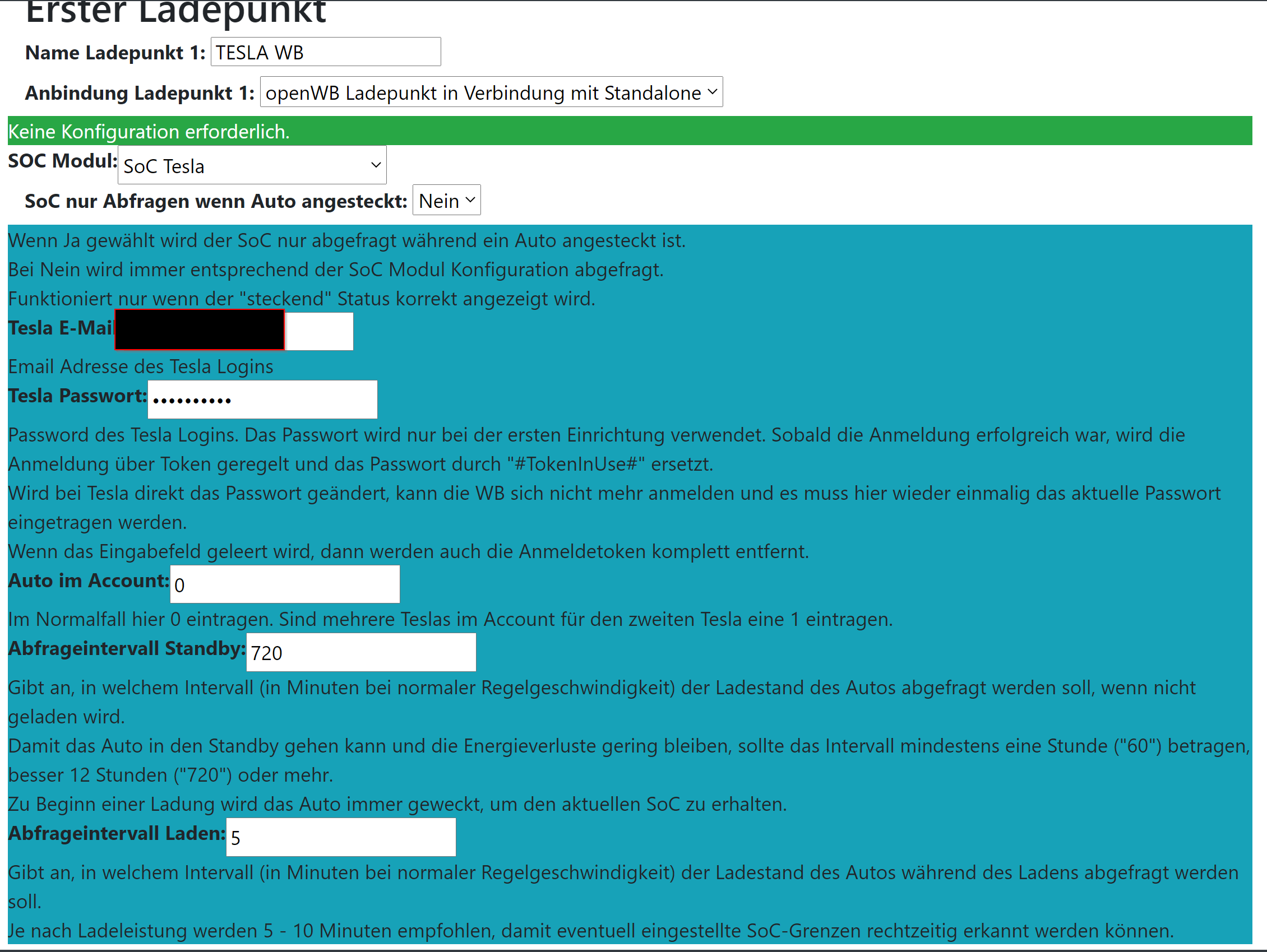 Der Button Sofortladen bleibt grau und die Ladeleistung verbleibt bei 0. Wenn ich am Auto selber die Ladung starte, zeigt es die Open WB ebenfalls nicht. Die OpenWb scheint also dem Tesla nicht das "LadeGo" zu geben. Sind die Einstellungen für den Ladepunkt 1 korrekt?