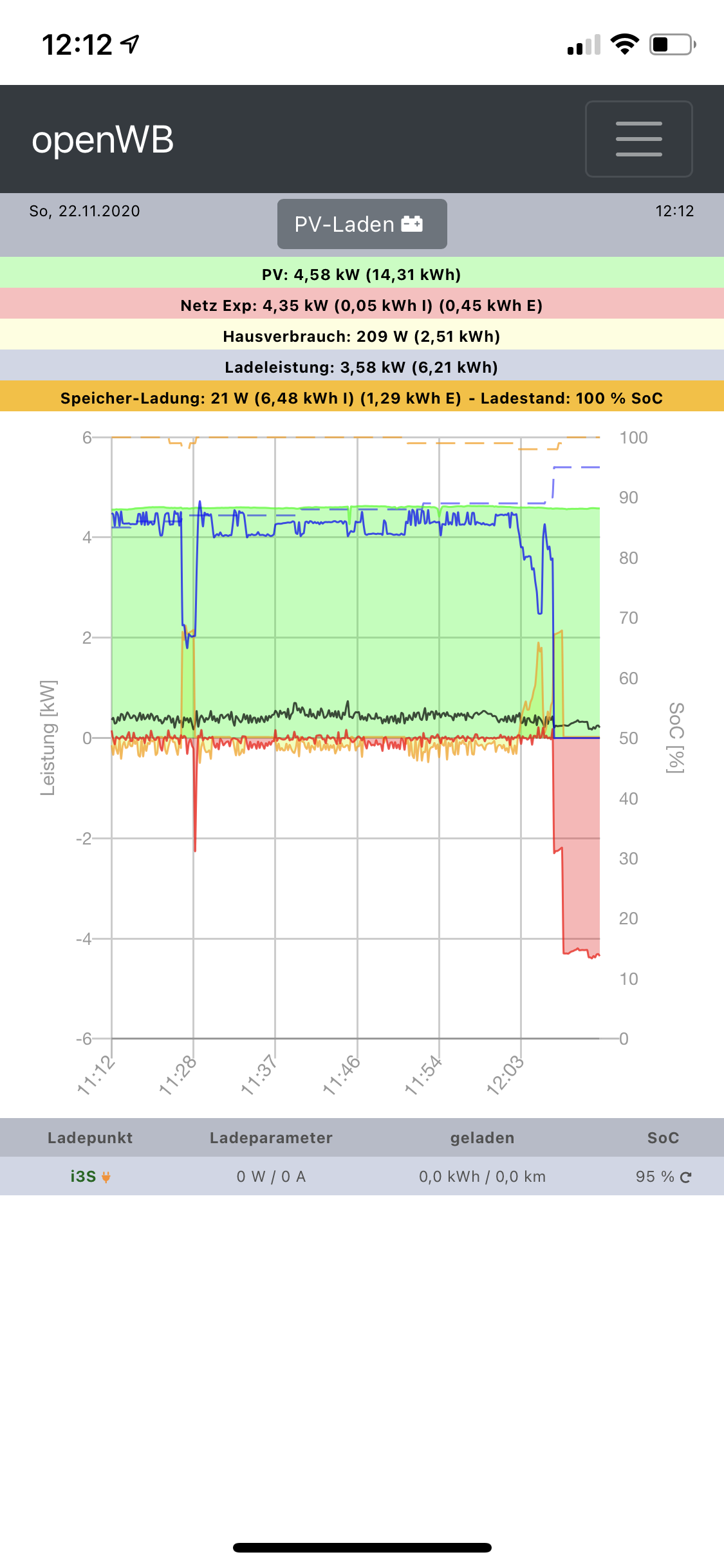 Die obere Text-Anzeige der Ladeleistung bleibt trotz Abschaltung des Ladevorgangs (SOC erreicht) auf der letzten Einstellung hängen. Der Graph und die Anzeige des Ladepunkts unterhalb zeigen es aber korrekt an. Das Bild zeigt es sehr gut.