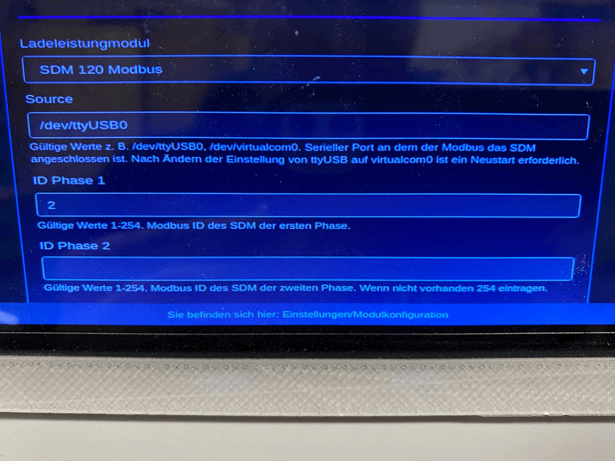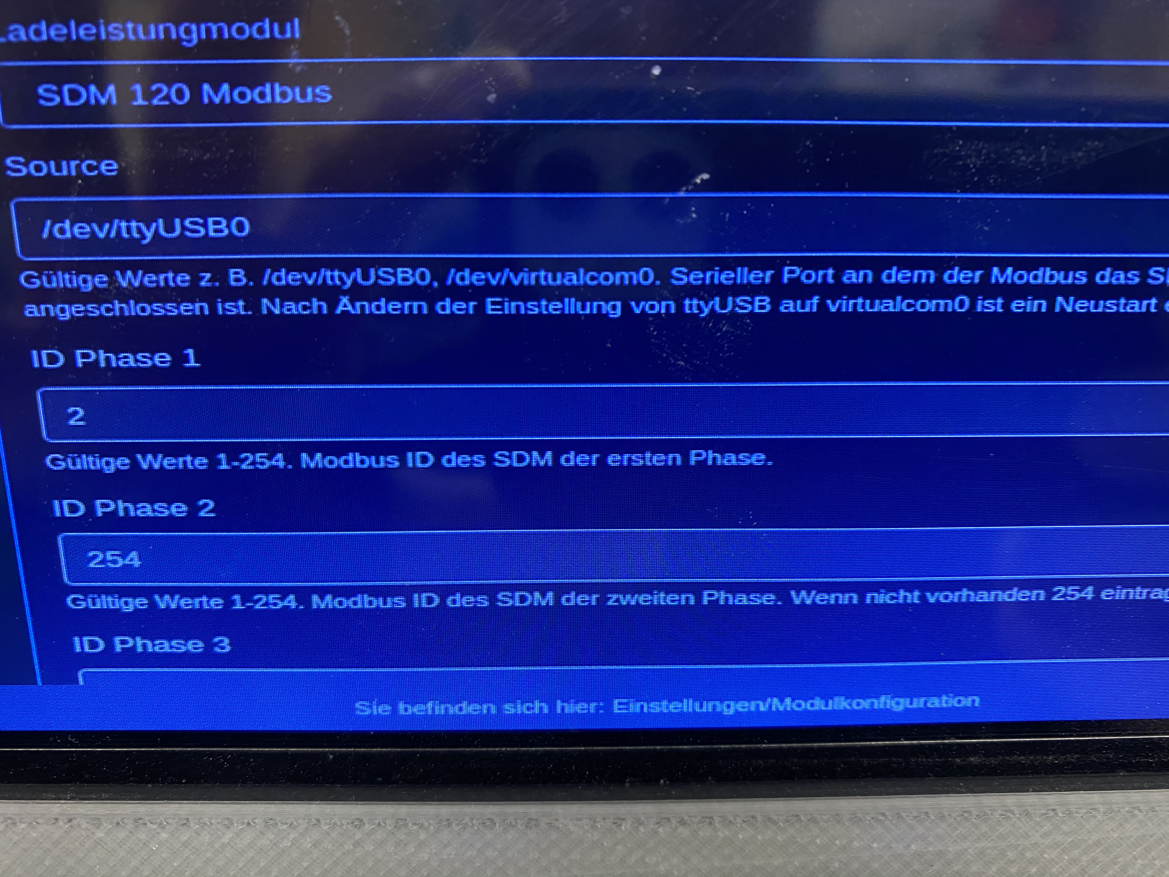 Entweder für ID Phase 2 / 3 254 eingeben oder als Ladeleistungsmodul den SDM630 wählen.