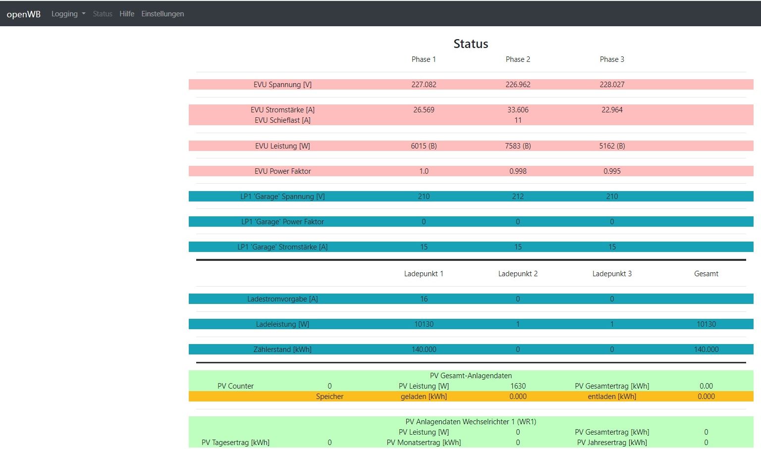 Die im Status angezeigten Spannungen am Ladepunkt sind mit 210V, 212V und 210V nicht besonders hoch.