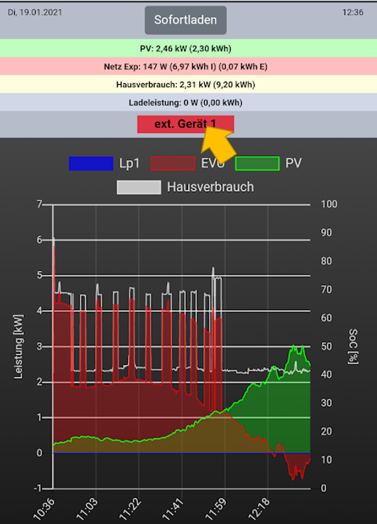 Hintergrund: Ich steuere über das "Externe Gerät" eine schaltbare Steckdose, welche bei ausreichend PV-Überschuss mit einem Ladeziegel das Auto lädt. Nun hätte ich aber bei wenig PV-Leistung trotzdem gerne die Möglichkeit den Ladeziegel komfortabel über die Übersichtsseite einschalten zu können. Dies wäre sozusagen eine Möglichkeit zum "Sofortladen" über externe Geräte.