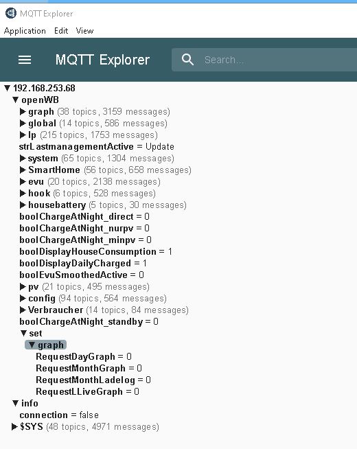In den Objekten werden aber zb die Set nicht angezeigt: Nun habe ich den MQTT Explorer runter geladen und mir die Werte mal angesehen, anscheinend published die openWB diese gar nicht? Ich möchte über mqtt.0.openWB.set.ChargeMode den Lademodus etc. setzen können, was aber nicht geht, da diese nicht vorhanden sind.