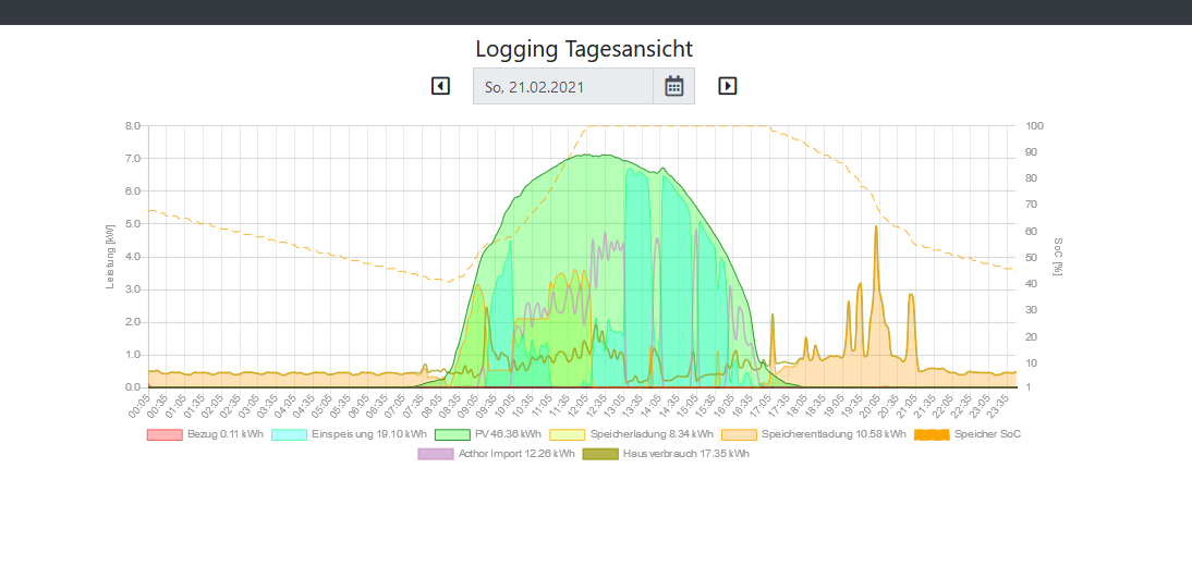 2021-02-18 17:03:31: EVU Bezug(-)/Einspeisung(+): -11 max Speicherladung: 6700