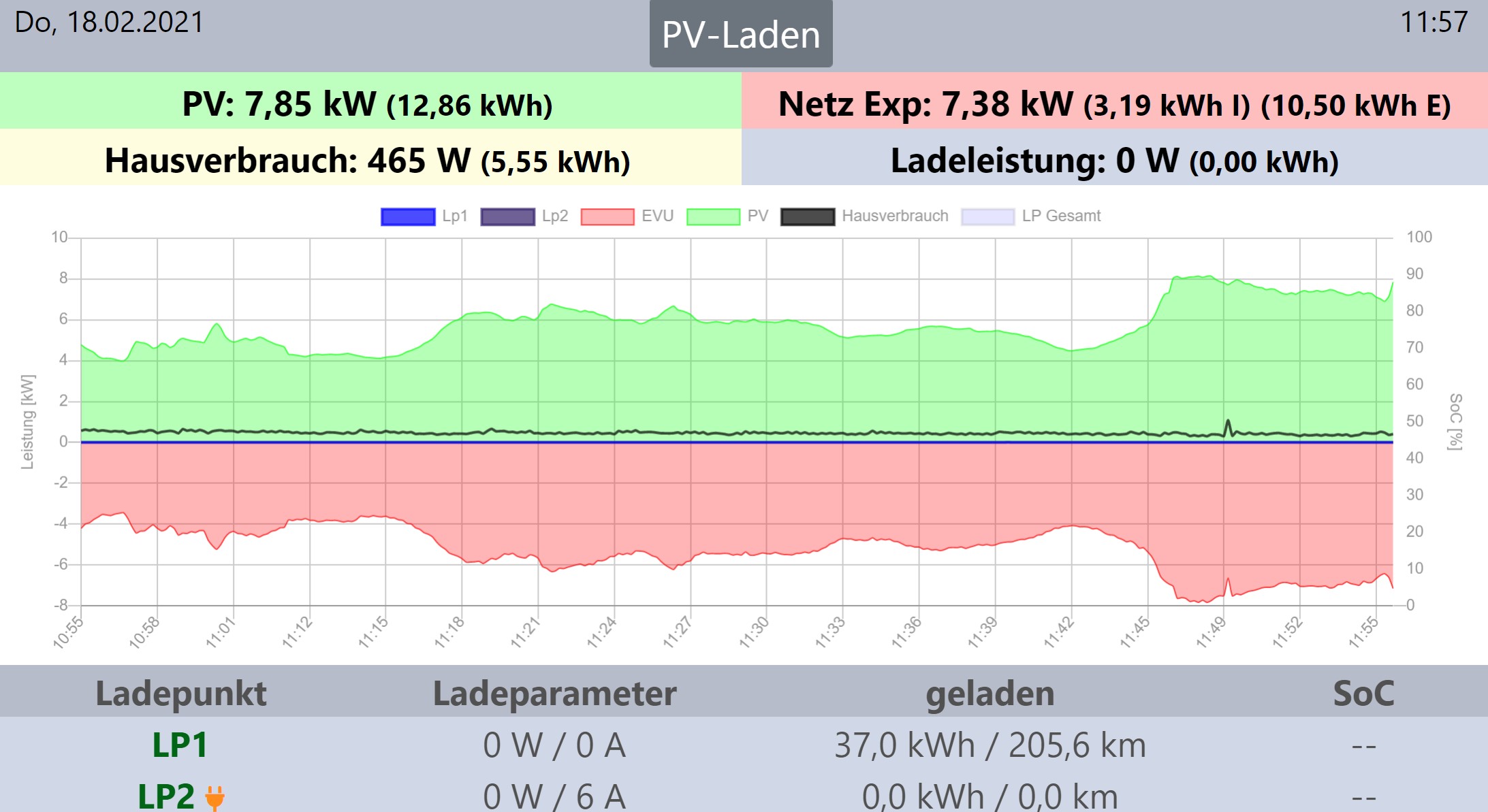 Heute lagen zwischendurch vielleicht mal 5,5kW Netto vor -> Smart EQ lädt.