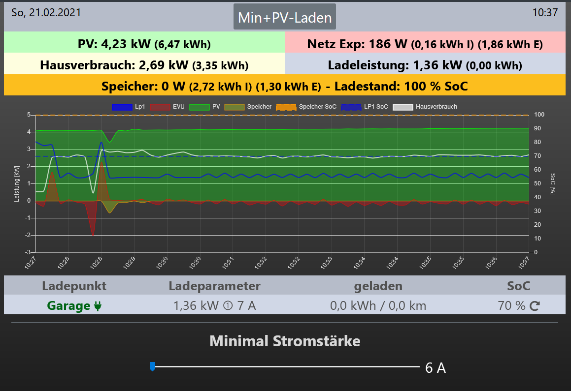 Auffällig ist das Ganze bei mir nur bei 6 / 7 Ampere - also in der untersten Ladestufe des GoE Chargers. Kann man die Regelung um diesen Betriebspunkt etwas robuster einstellen oder kann ich bei den Einstellungen etwas ändern, sodass es zu keinem Netzimport bzw. nicht zur schwingenden Regelung kommt?