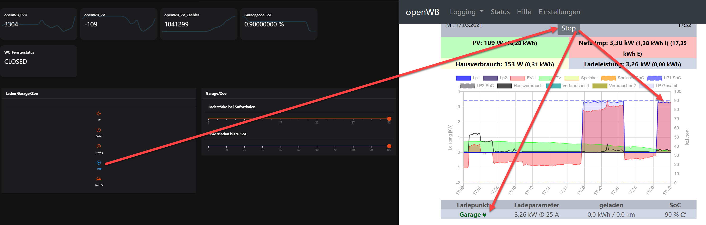 Zum Beispiel des Screenshots: Ich stelle in openhab auf Stop, wird in openwb angezeigt, aber das Auto lädt munter weiter (bis ich dann in openwb nochmal stop auswähle)