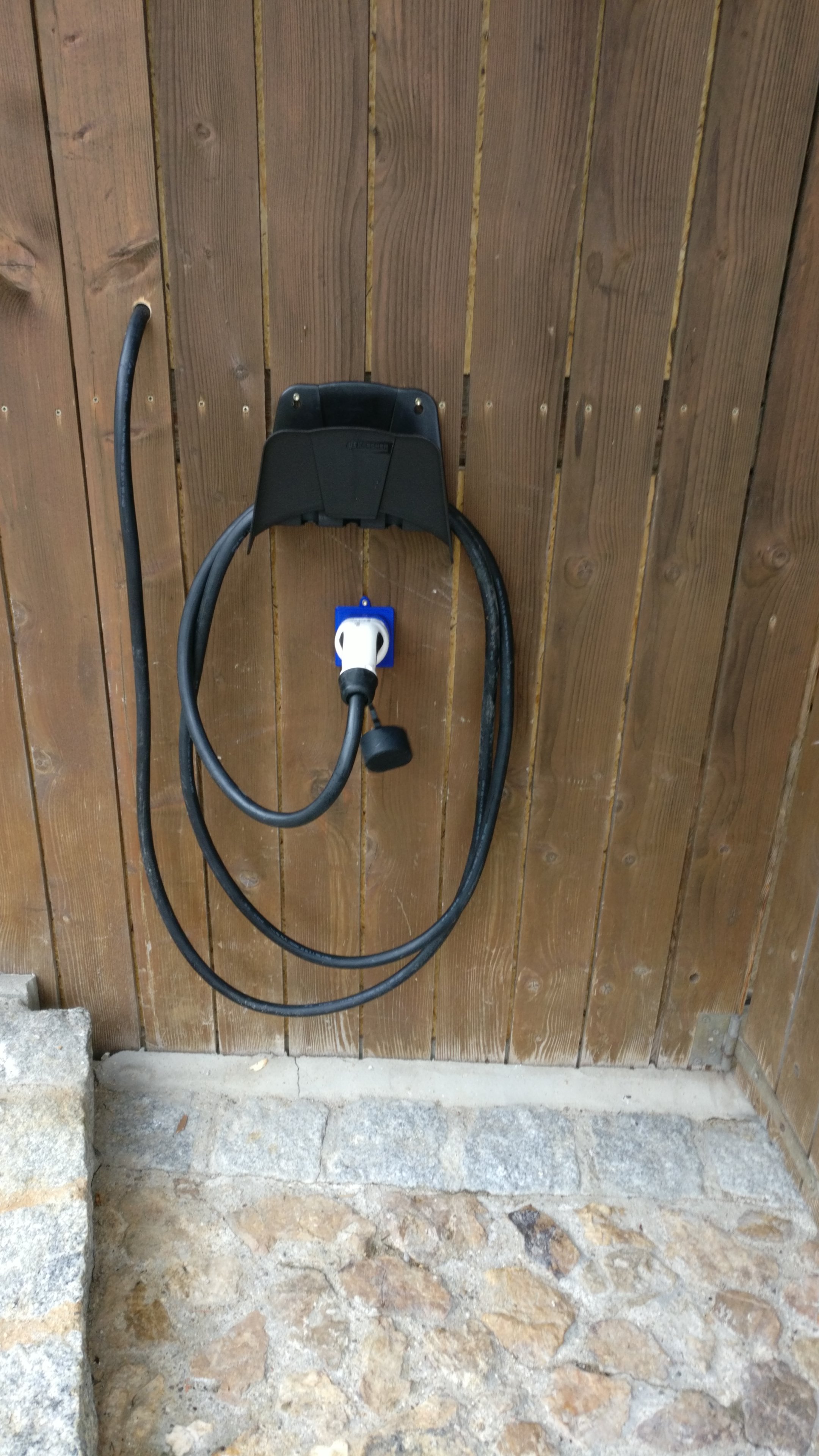c) Oder eben einen go-e-Charger links unter Mauersims mit Camping-CEE-32A-Dose links unten um die Ecke zur Verschalung sowie BMW-Kabelhalterung rechts daneben (Problem: Stromzuleitung ist oberhalb des go-e-Chargers; Anschluss an CEE-Dose ziemlich kreuz & quer verlegt und hässlich; WLAN-Empfang fraglich dort; Vorteil mobile und stationäre Lösung). Dazu einen openWB-RPi3B+ nach innen legen