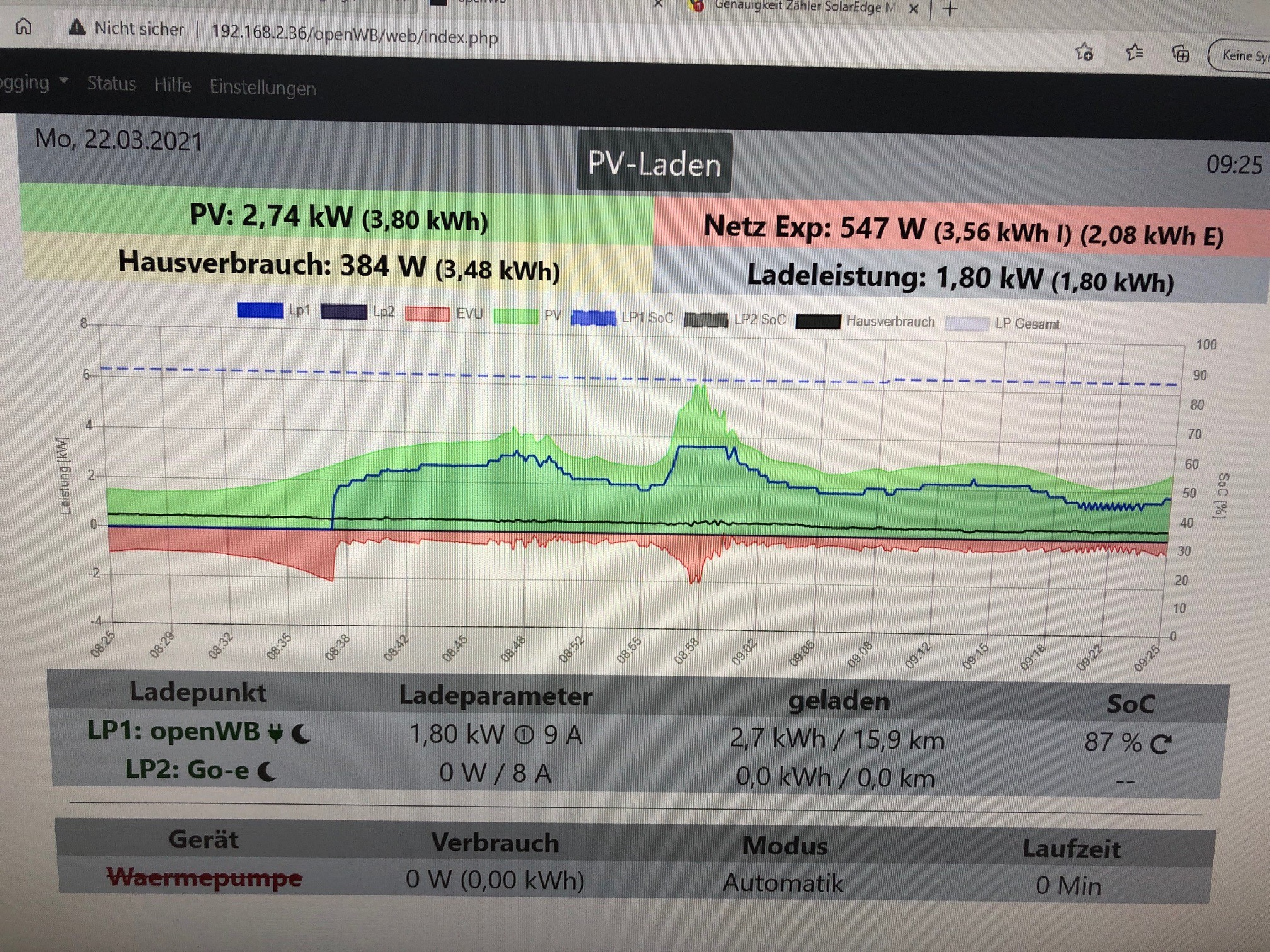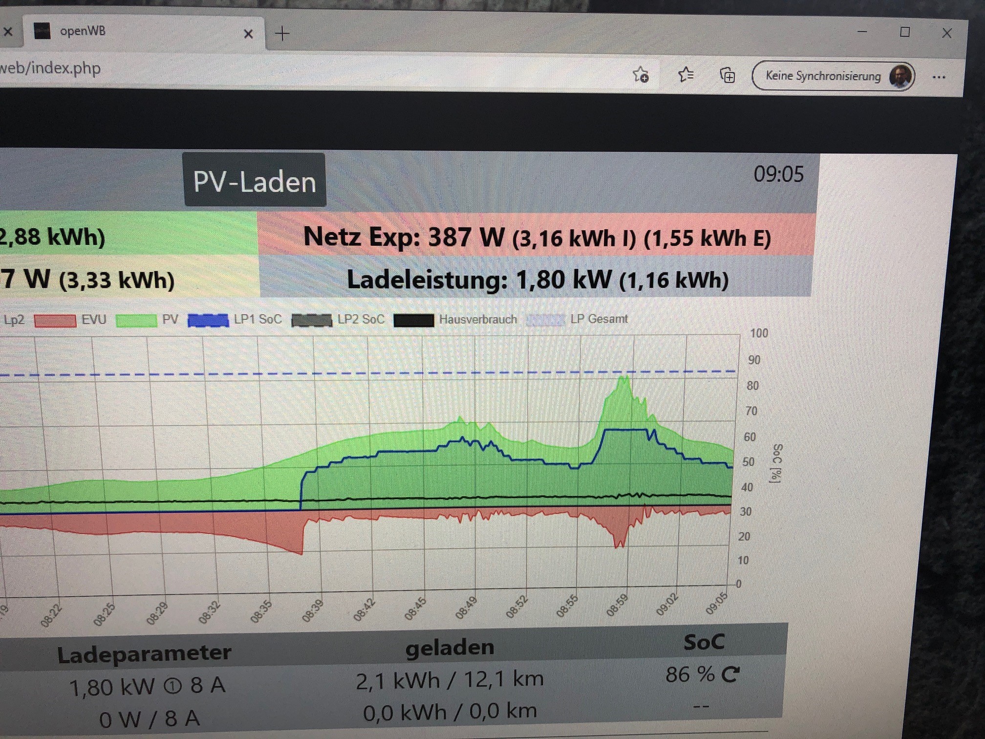 Obwohl die Anlage so eingestellt ist, das sicher kein Import während der 1P Ladung stattgefunden hat, zählt der Import von 3.16kWh auf 3.56kWh hoch. Ich vermute mal, dass der Modbuszähler von SE nicht saldiert, sondern das was auf L1 bezogen wird als Import zählt und das was auf L2&L3 auf Export gewertet wird, da ich auf 3P einspeise.