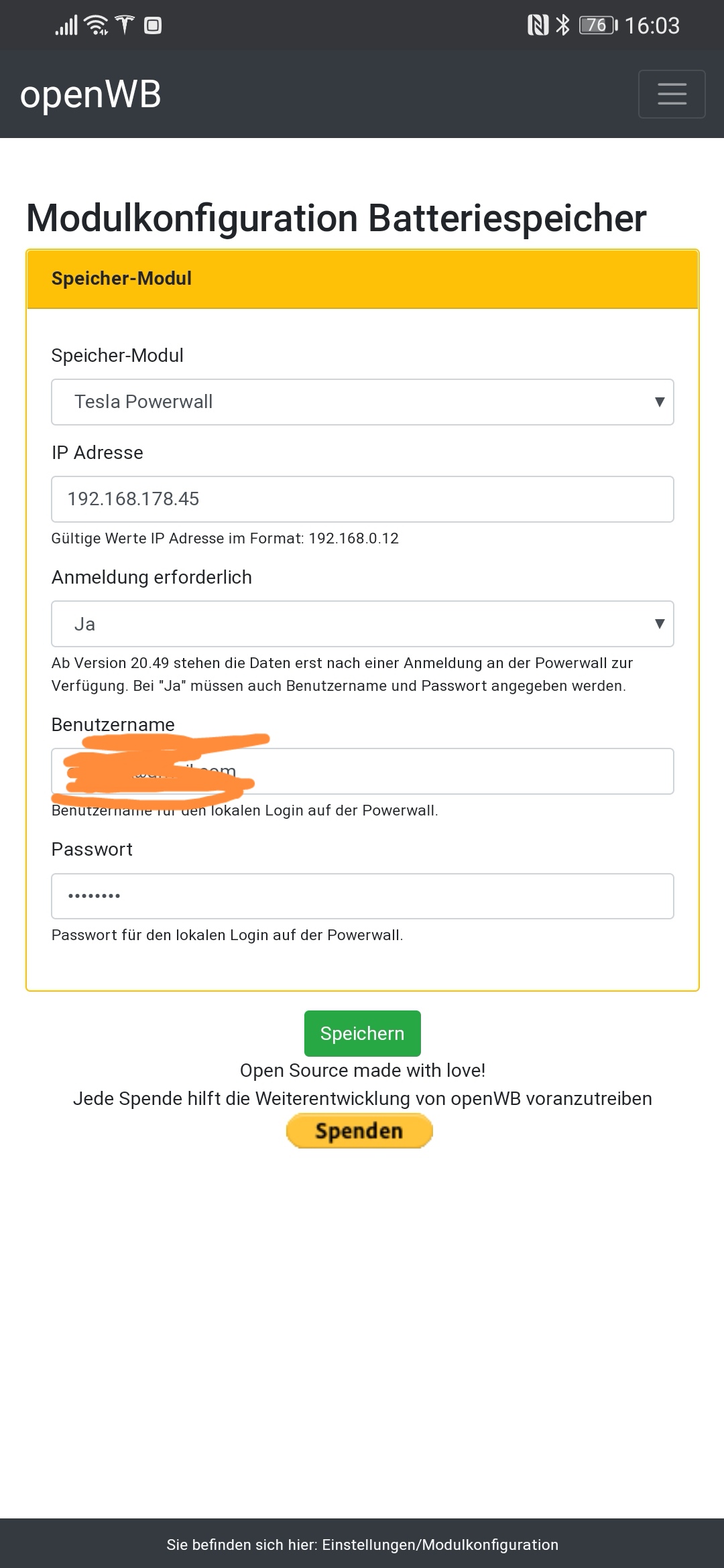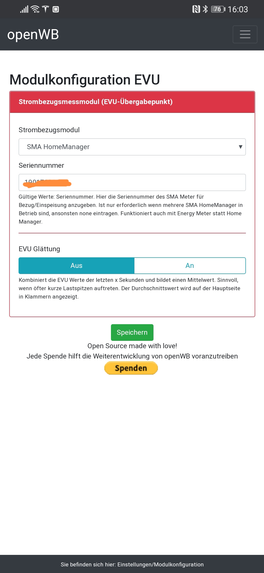 Ich nutze nur EIN PV Modul, also das für SE. Liest denn die OpenWB bei SE den Hausverbrauch nicht aus? Der wird bei mir ja sogar manchmal negativ, was ja nicht sein kann.openWB hat geschrieben: Di Mär 23, 2021 1:11 pmDas bezog sich darauf das man dann theoretisch auch den Hausverbrauch auslesen könnte und die Spitzen wären weg.Hast du einen SolarEdge mit Smartmeter wäre das einfach.