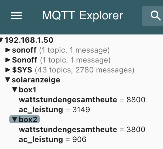 Deshalb noch ein andere Idee: Die Solaranzeige stellt die gesuchten Daten per MQTT bereit. Und über ein MQTT-PV-Modul sollte ich sie dann eigentlich in die openWB bekommen, wenn ich das richtig verstanden habe. Die Daten sehe ich auch im MQTT-Explorer. Wenn ich in der openWB ein MQTT-PV-Modul konfigurieren möchte, verstehe ich es so, dass ich irgendwie die Werte openWB/set/pv/1/W und openWB/set/pv/1/WhCounter per MQTT setzen müsste. Ich habe dazu Ulrich, den Entwickler der Solaranzeige, kontaktiert, weil ich vermute, dass es die Solaranzeige ist, die per MQTT die Werte in die openWB schreibt. Er ist so nett, sich dazu beim openWB-Support zu melden.