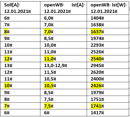 Ich habe dann einen Test gemacht: Im Modus Sofortladen den Ladestrom zuerst immer um 1A erhöht und den resultierende Iststrom notiert und dann den Ladestrom immer um 1 A reduziert bis zum min. von 6A. Das sieht nicht so optimal aus.