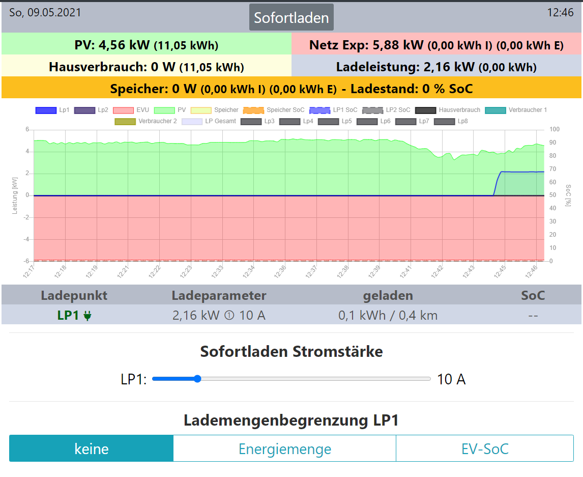 Außerdem betriebe ich eine PV Anlage mit den unten aufgelisteten Komponenten. Spielt diese beim "Sofortladen" aber überhaupt eine Rolle? Sollte er da nicht mit dem von mir vorgegebenen Maximum unabhängig von der PV Erzeugung einfach laden?
