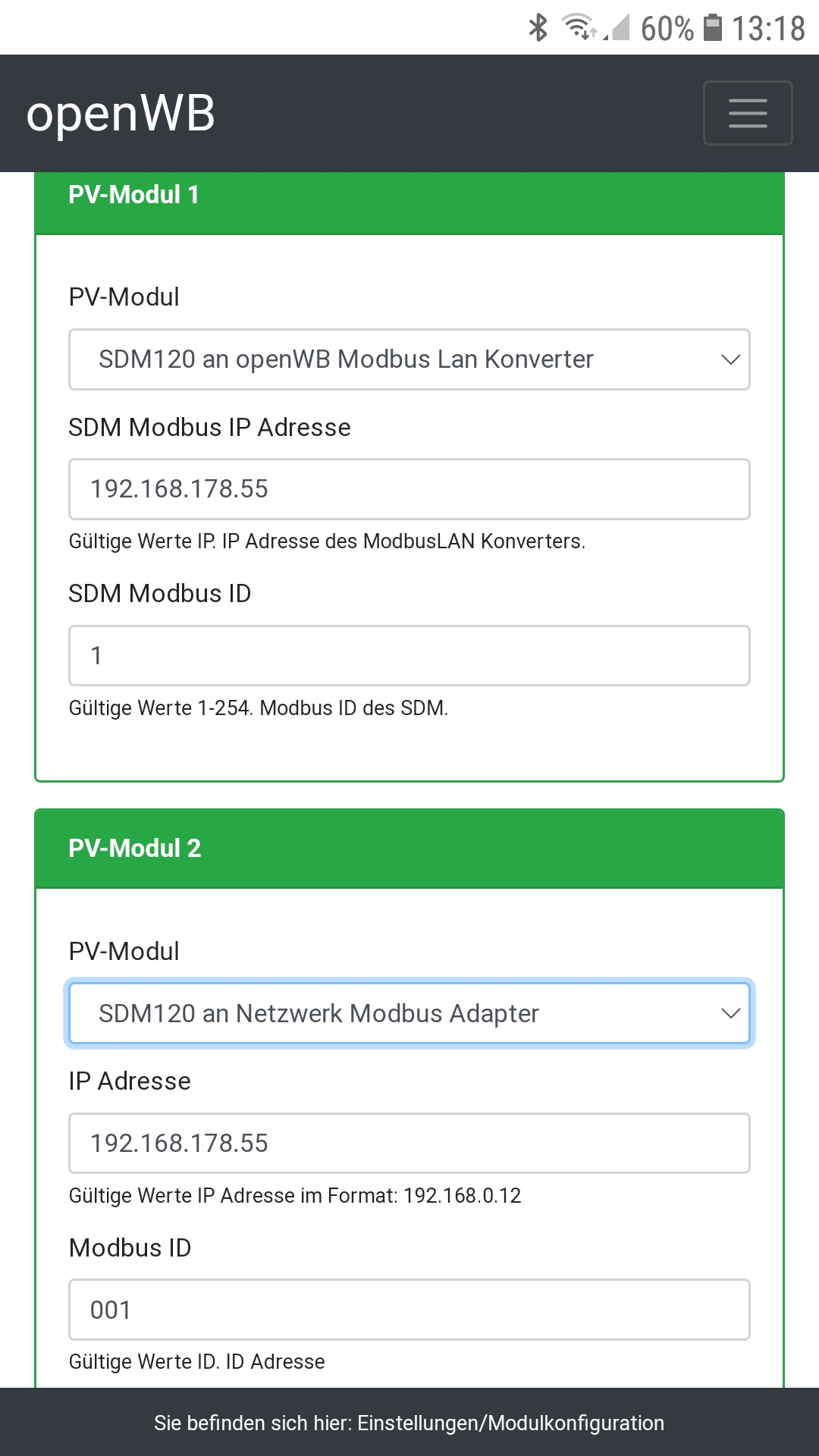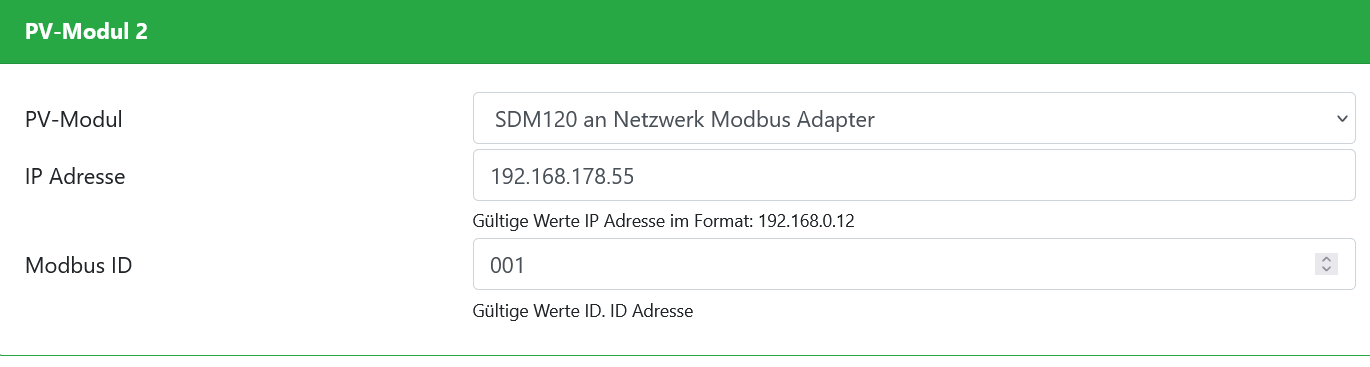 Var. 1) Im PV2- Modul/ unter Auswahl "SDM120 an Netzwerk Modbus Adapter" die Möglichkeit der Einbindung eines 2. SDM 120 (gleiche IP, 2.Modbus- ID zulassen, gleicher Modbus) schaffen. Die Summe beider SDM wäre mir ausreichend. Gleichzeitig Übernahme ins 1. PV- Modul.
