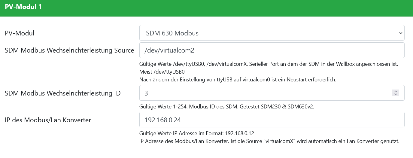 3.) Oder gibt es eine weitere (einfache) Möglichkeit den SDM 630 direkt ins PV 2- Modul inkl. einer eigenen IP zu integrieren? Im PV1- Modul habe ich folgende Variante entdeckt, nur leider kann ich nicht so viel mit den dargestellten Einträgen anfangen.