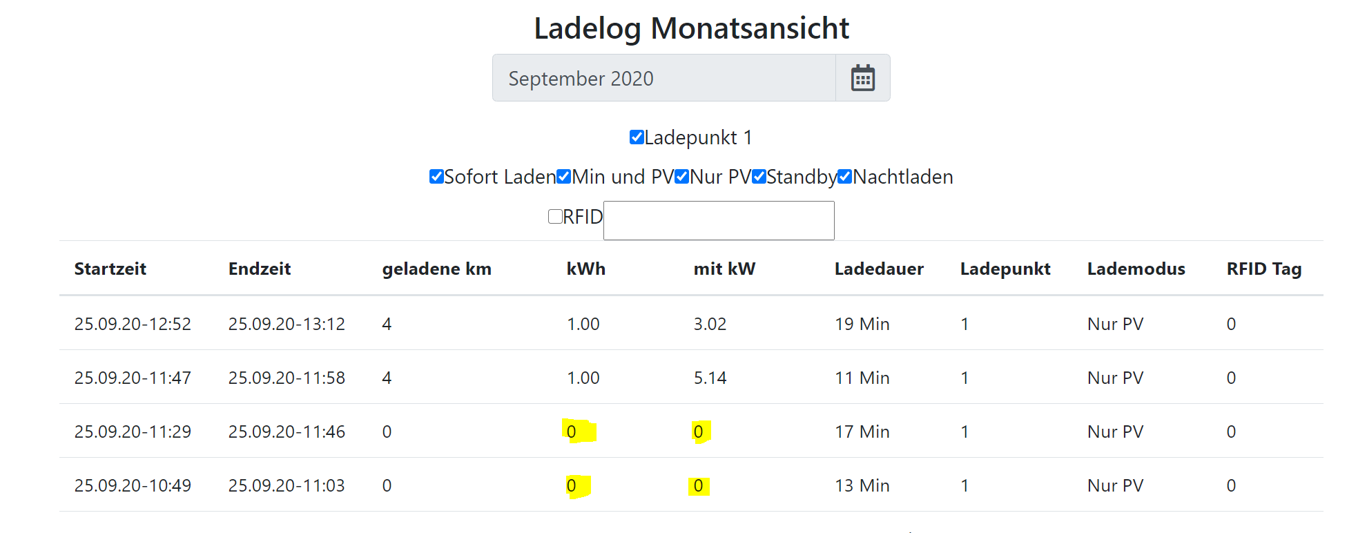 Ah, danke. Wenn die Lademenge immer aus dem gesamt-Zählerstand ermittelt wird, dann stimmt ja immerhin nachher die Summe. Faktisch ist es dann auch kein Runden.Wenn ich 4 mal 0.25kWh lade, wird 3 mal „0“ und beim letzten mal „1“ angezeigt, richtig?openWBSupport hat geschrieben: Fr Sep 25, 2020 3:51 pm Als absolute ZÄhlerstand wert liefert die Go-e leider nur volle kWh. Daher muss das goe uber ein FW Updaten lösen.