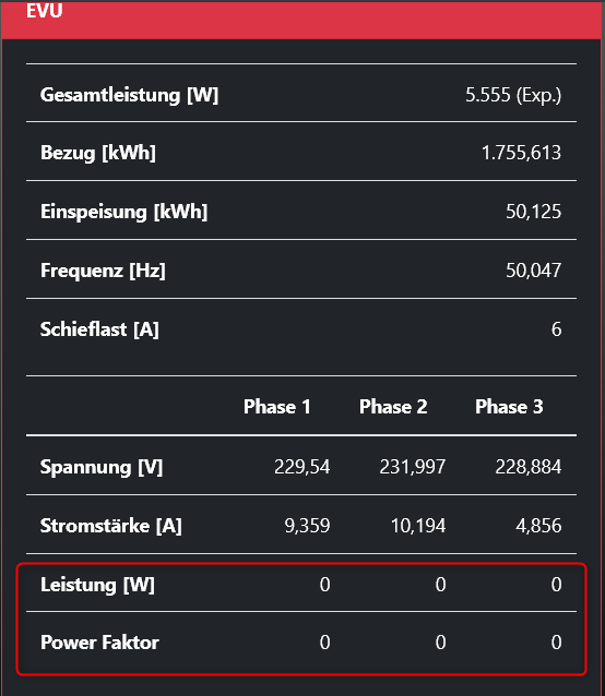 Lediglich die Anzeige der Leistungen der drei Phasen funktioniert nicht. Ebenso die Anzeige des PF. Ich gehe davon aus, dass die Werte selbst von der OpenWB errechnet werden, zumindest scheint es keine Topic zum setzen der Werte zu geben?