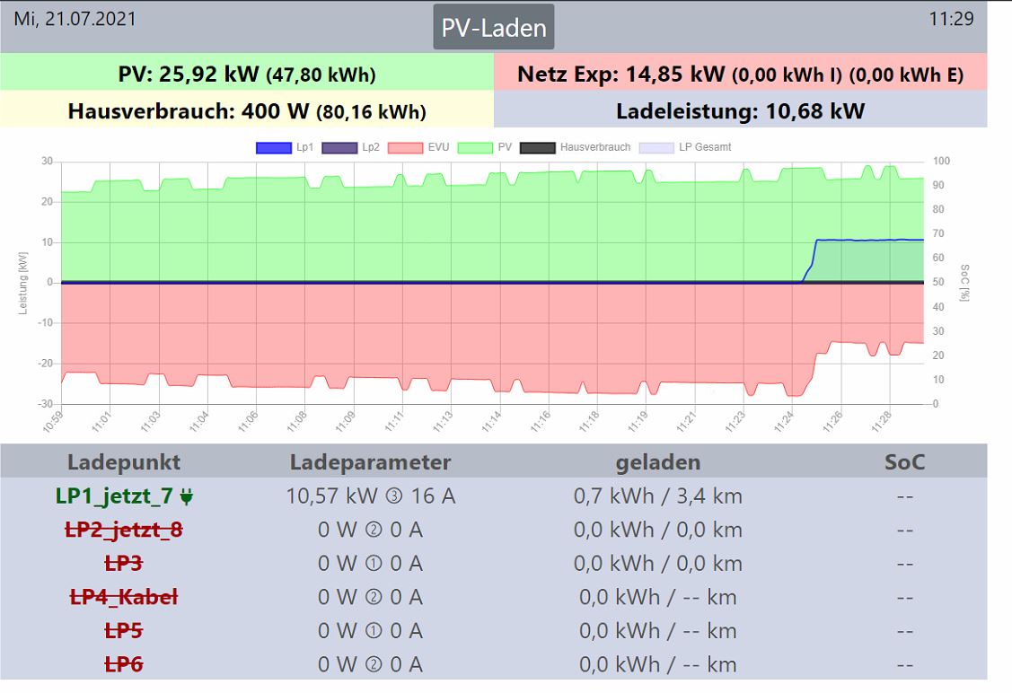 2021-07-22 11:47:32: LP1, Lademodus NurPV. Ladung gestartet mit 6 Ampere (LV0)