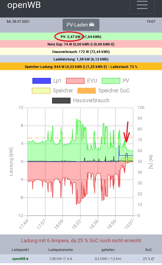 Der Ladestrom blieb bei 6A obwohl er hätte noch weiter hoch modulieren können.