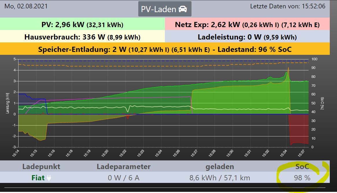 Das ist wirklich komisch, da die App bescheid weiss, und in openWB seit Tagen die 98% wie festgenagelt hängen. Gestern von 75% auf 87% geladen, heute den Rest bis 100%. Also, der Fiat-Server weiß bescheid. Das Update-Verhalten des Autos ist allerdings bescheuert, während eine Ladevorganges bekommt der Ladestatus kein Update. Wer sich das ausgedacht hat...