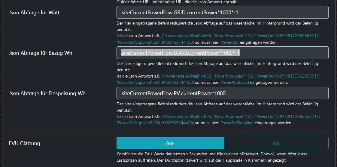 Der Solaredge WR holt sich den Bezug über einen S0 Zähler (das wusste ich bei der Installation der PV Anlage leider nicht besser), bietet ihn aber leider nicht über Modbus over TCP zur Abfrage an und sendet ihn nur an das Solaredge Portal zur Anzeige im SE Portal. Deswegen habe ich mir gedacht ich hole mir den Bezug über eine JSON Abfrage von der WebSite mit