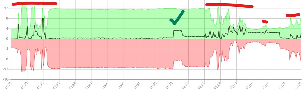 Auch hier sieht man es am Anfang, die Zacken... Ich habe es oben markiert in rot. Wirkliche Verbraucher, wie z.B. bei ca. 11:58 erzeugen ein sauberes Diagramm, siehe grüner Pfeil.