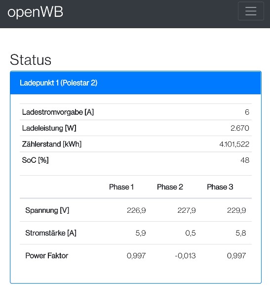 Und hier die falsche Anzeige (zeigt nur 1 Phase an, obwohl auf zwei geladen wurde: