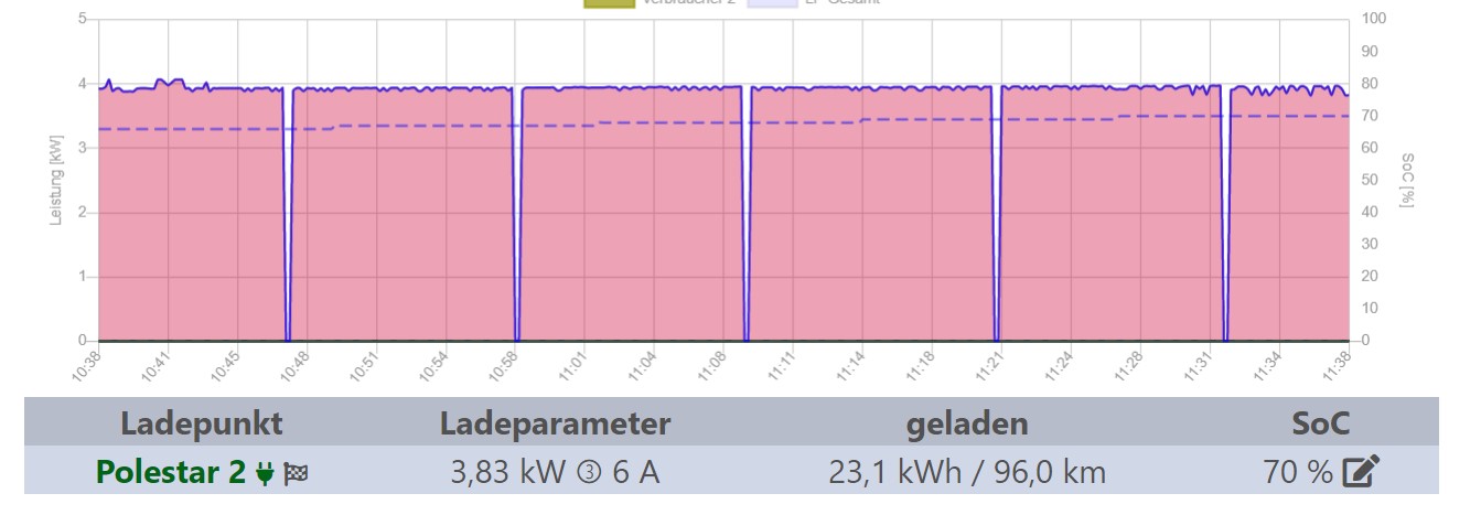 Und hier das gleiche per Zielladen mit 4kW/6A auf Ziel-SoC 80% und wieder bricht alle 10 Minuten die Ladung voll ein.