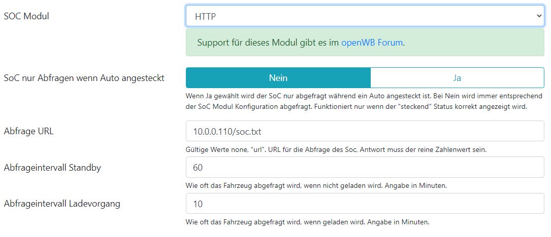 Die Konfiguration, die du gezeigt hast betrifft das SOC-Modul. Über dieses Modul wird nur der aktuelle Ladezustand vom Auto abgefragt und sonst nichts. Darüber kommt keinerlei Information, ob das Auto lädt.MrZag hat geschrieben: Mo Sep 06, 2021 11:56 am Bei der jetzigen Einstellung verstehen sich das Auto und die go-e (openWB) teilweise nicht. Das habe ich bemerkt, da das Auto sagt, es lädt nicht, go-e und openWB sagenaber es lädt mit xxKWh.