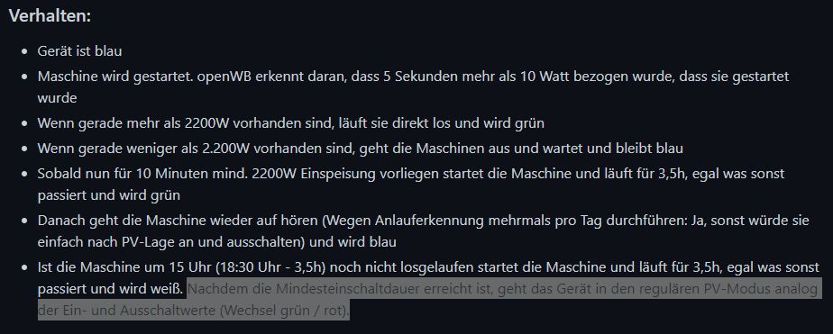 sonnencorsa hat geschrieben: Do Aug 19, 2021 1:29 pm Um den Eigenverbrauch an Sonnenstrom weiter zu erhöhen, könnte man überlegen, die Einschaltschwelle für Smart Home-Geräte ab einer bestimmten Tageszeit (z. B. 14:00 Uhr) kontinuierlich abzusenken, so dass das jeweilige Gerät bereits bei weniger Überschuss startet. Plastisch ausgedrückt: Die OpenWB "versucht" erstmal, das Gerät nur mit Überschuss zu betreiben, ab einer bestimmten Uhrzeit wird aber klar, dass dieses Ziel für den jeweiligen Tag wohl unerreichbar ist (bzw. das Risiko steigt, dass man "leer ausgeht" und überhaupt keinen Überschuss mehr nutzen kann), weswegen dann auch der Zukauf von (zunehmend mehr) Netzstrom zugelassen wird.