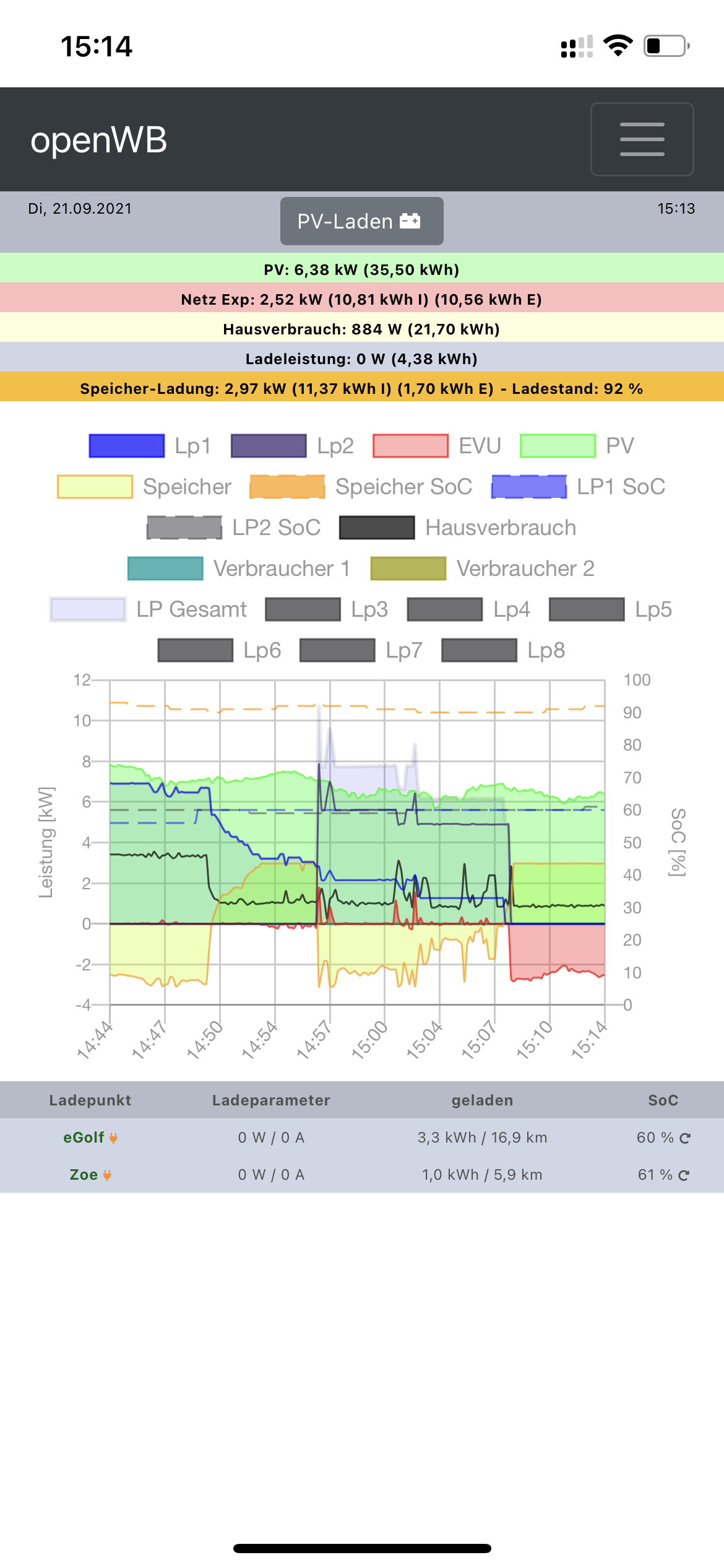 In der aktuellen Softwareversion 1.9 geht das nicht. Mit 2.0 soll das Handling von mehreren Ladepunkten gehen. Mich stört das aktuell auch, denn momentan wird bei zwei Ladepunkten gewartet, bis genügend Überschuss für beide vorhanden ist. Man könnte ja in der Wartezeit ja schon mal das eine Auto laden, wenn dafür genügend Überschuss da ist und den zweiten dazu schalten, wenn's auch für diesen reicht. Ist aber noch nicht so, wird hoffentlich bald kommen.smokinggallier hat geschrieben: Mi Sep 22, 2021 11:57 am Und konnte ich dafür eine Einstellung ändern, etwa dass der Golf priorisiert wird?